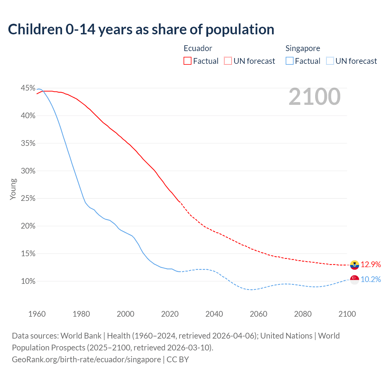 According to the latest available data on birth rates, the fertility rate in Ecuador was 1.82 children per woman in 2023, compared to 0.97 in Singapore in 2023. The replacement level is considered to be 2.1 children per woman.