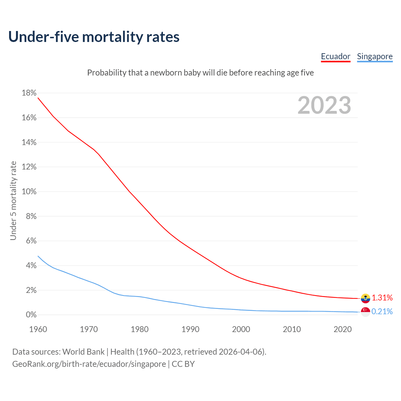 The chance that a newborn baby will die before reaching age five is 1.31% in Ecuador and 0.21% in Singapore. Above is a chart with historical data on under-five mortality rates.