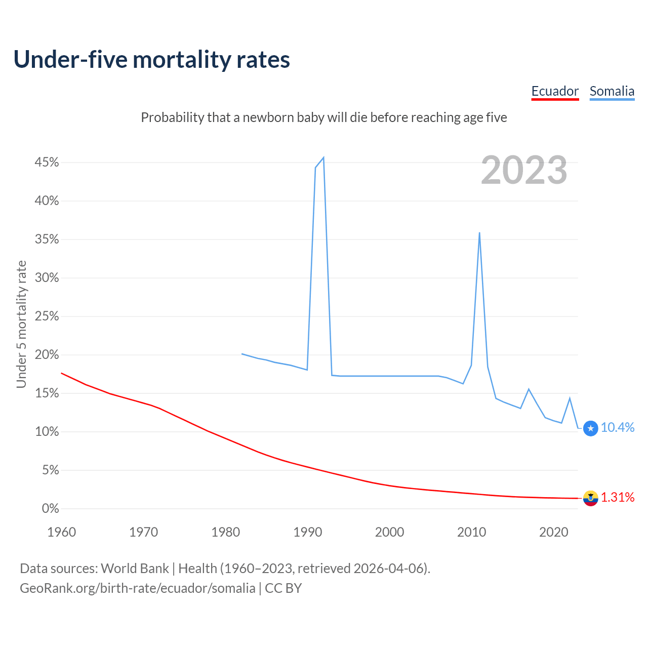 The chance that a newborn baby will die before reaching age five is 1.31% in Ecuador and 10.4% in Somalia. Above is a chart with historical data on under-five mortality rates.