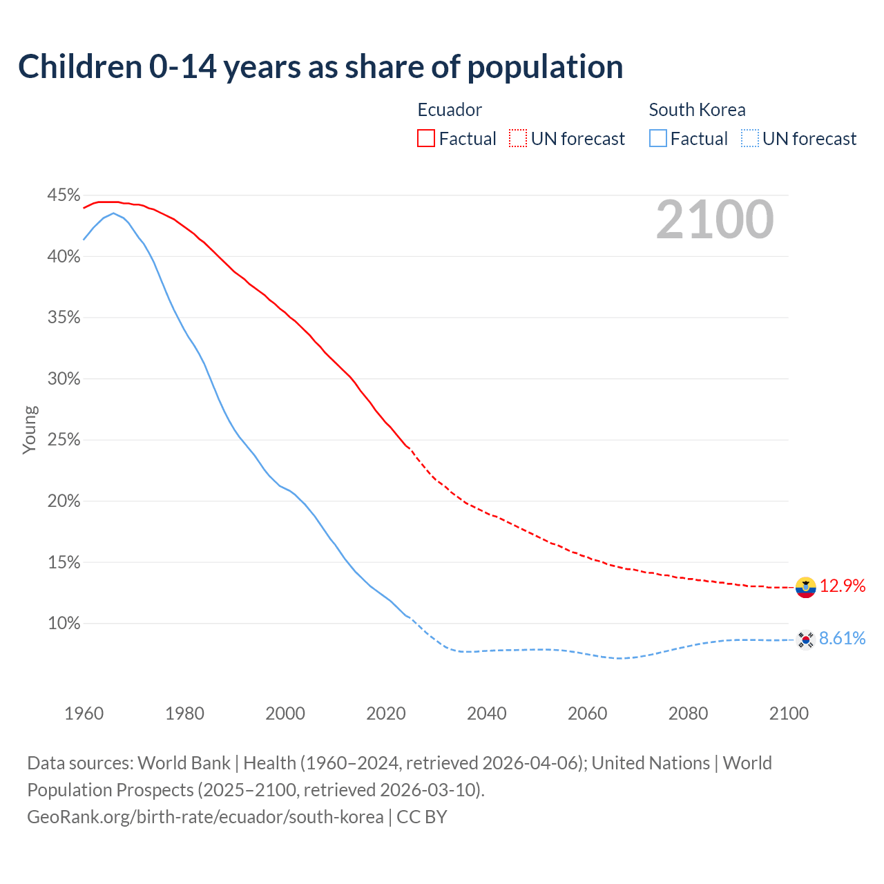 Ecuador has an annual birth rate of 15 births per 1,000 people, compared to 4.5 for South Korea. The average number of children a woman is expected to have during her lifetime — the fertility rate, is 1.82 in Ecuador and 0.72 in South Korea — 60.4% difference.