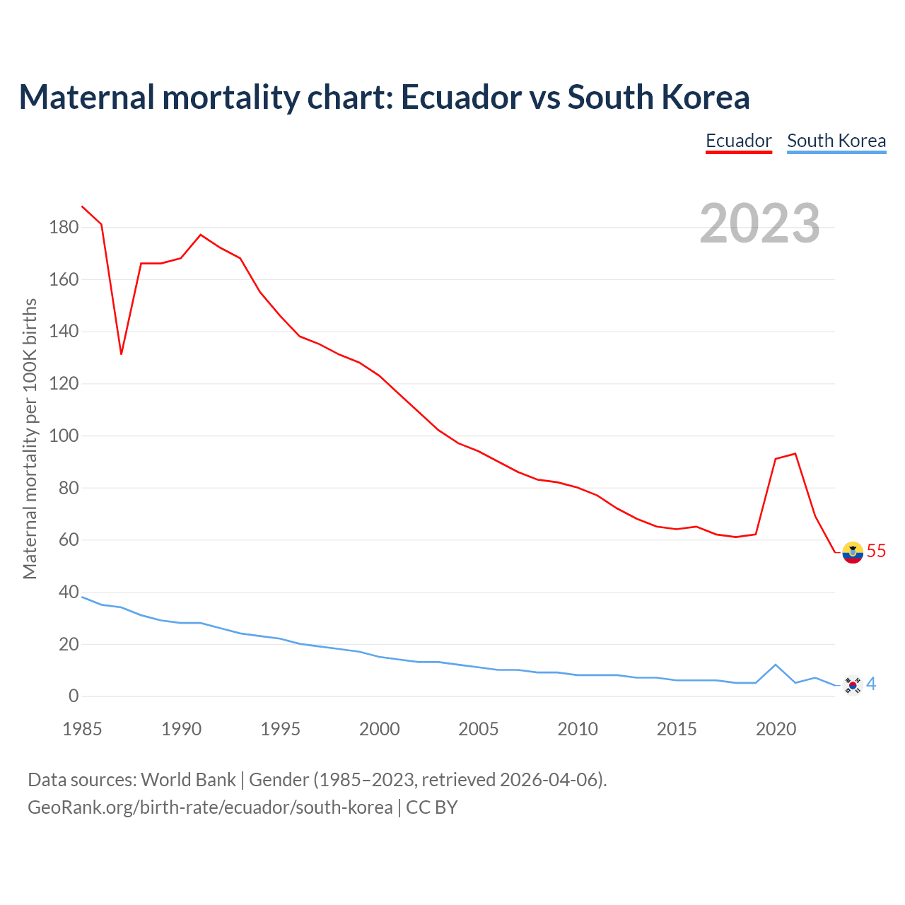The maternal mortality rate, which is the probability of dying during childbirth or within 42 days of pregnancy termination, is 55 deaths per 100,000 live births in Ecuador, compared to 4 deaths in South Korea.
