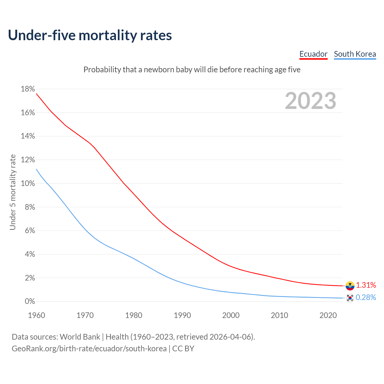 The chance that a newborn baby will die before reaching age five is 1.31% in Ecuador and 0.28% in South Korea. Above is a chart with historical data on under-five mortality rates.