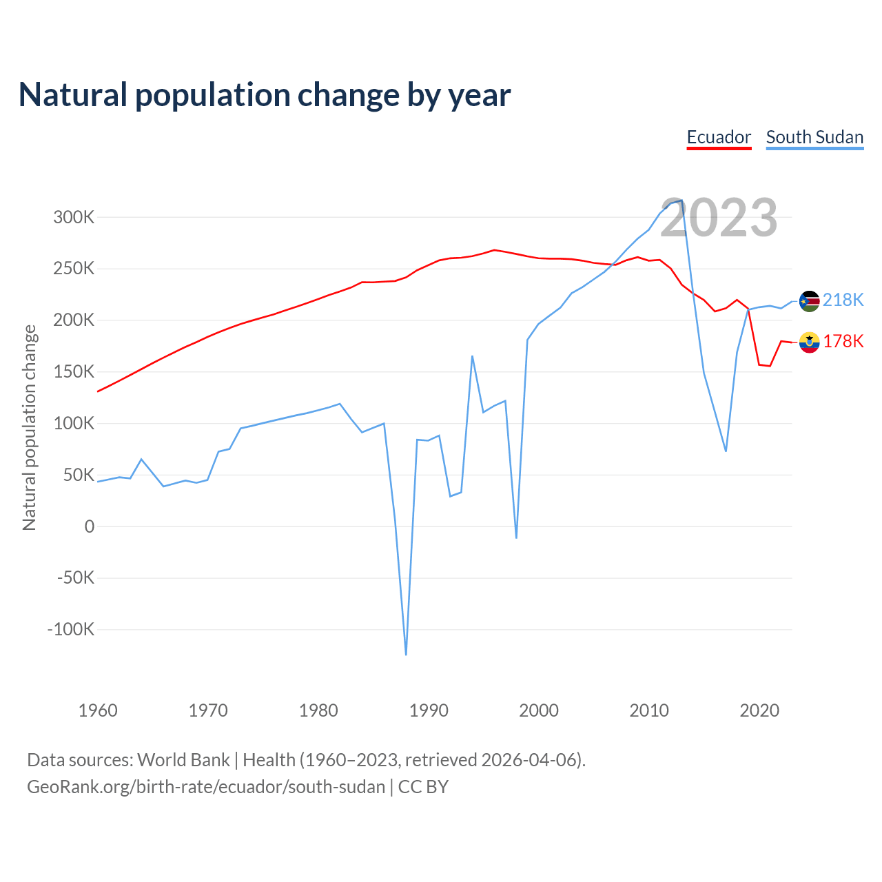 Ecuador has an annual birth rate of 15 births per 1,000 people, compared to 28.6 for South Sudan. The average number of children a woman is expected to have during her lifetime — the fertility rate, is 1.82 in Ecuador and 3.86 in South Sudan — 112% difference.