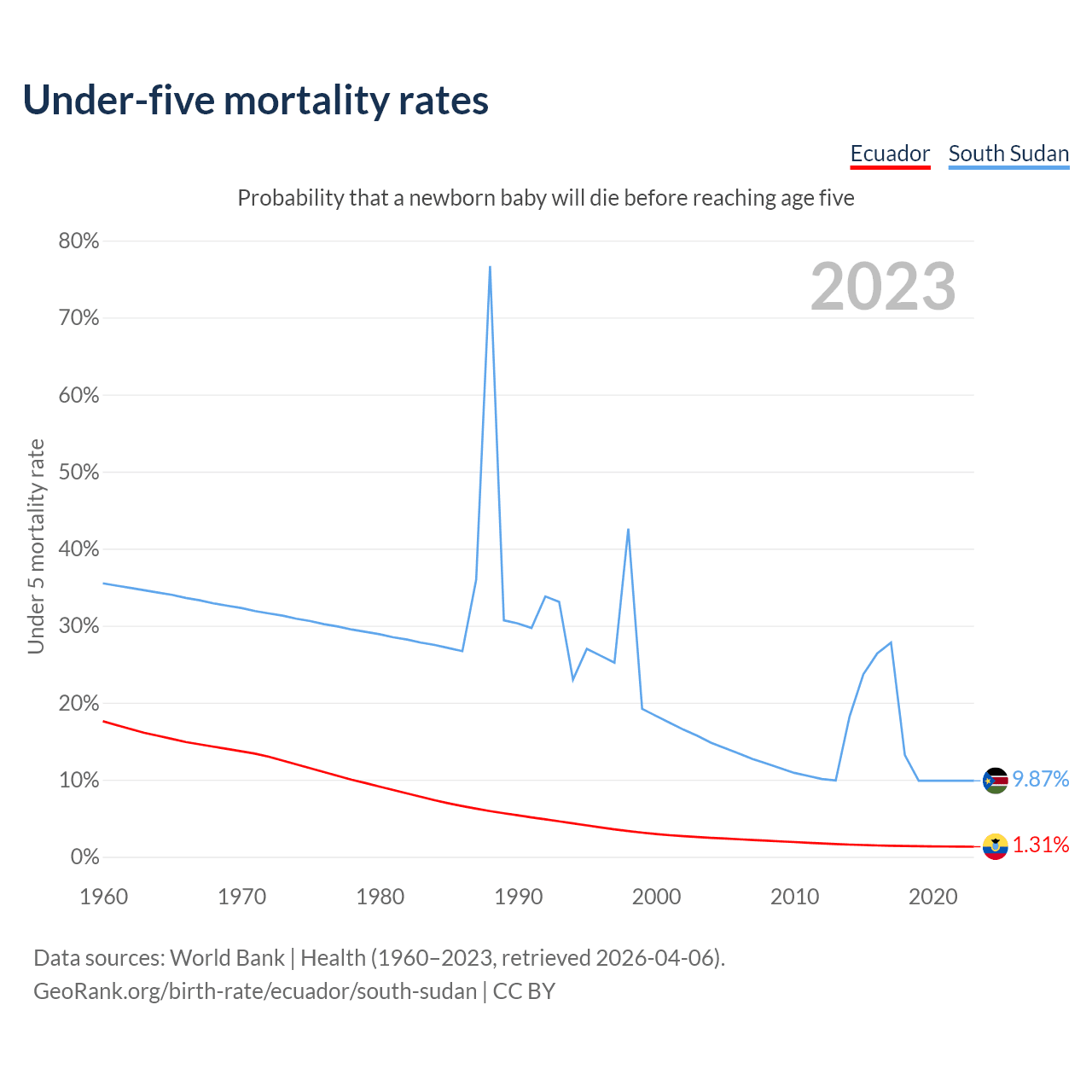 The chance that a newborn baby will die before reaching age five is 1.31% in Ecuador and 9.87% in South Sudan. Above is a chart with historical data on under-five mortality rates.