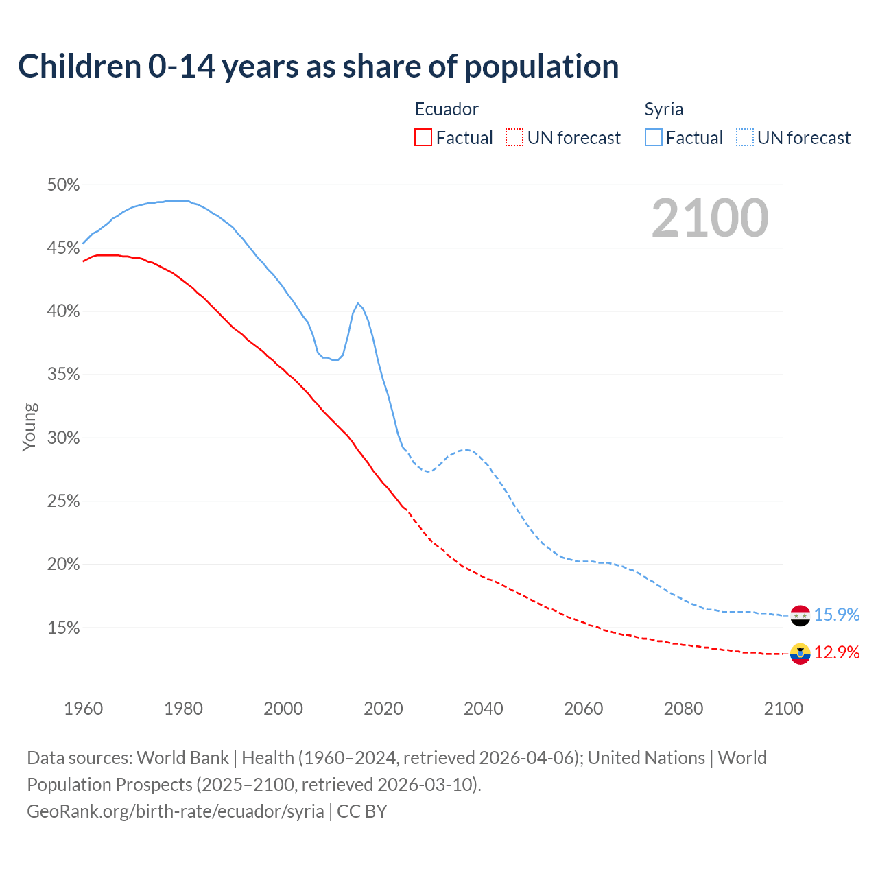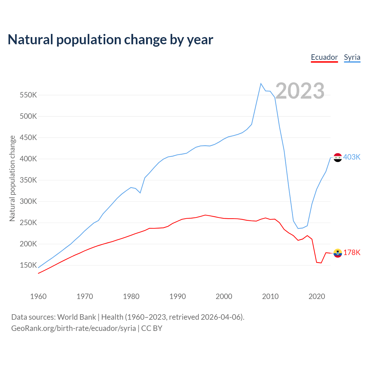 Ecuador has an annual birth rate of 15 births per 1,000 people, compared to 22.1 for Syria. The average number of children a woman is expected to have during her lifetime — the fertility rate, is 1.82 in Ecuador and 2.71 in Syria — 48.8% difference.