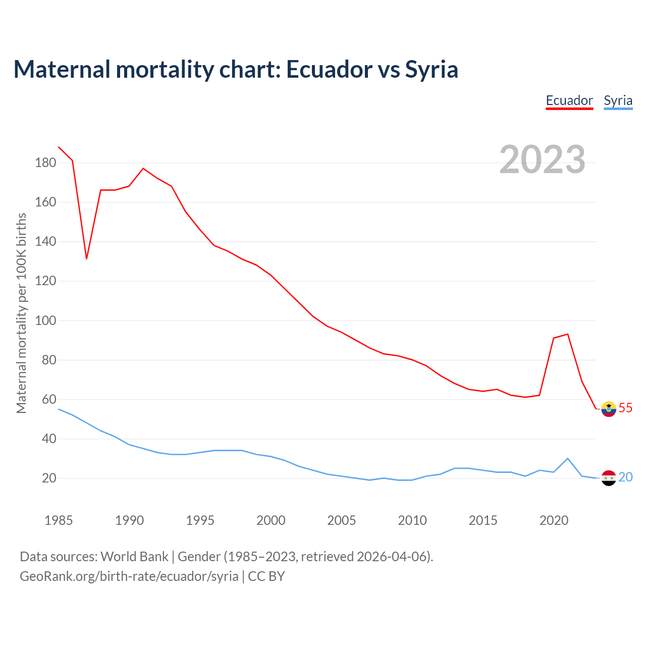 The maternal mortality rate, which is the probability of dying during childbirth or within 42 days of pregnancy termination, is 55 deaths per 100,000 live births in Ecuador, compared to 20 deaths in Syria.