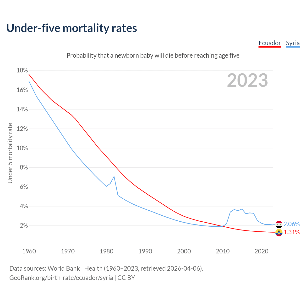 The chance that a newborn baby will die before reaching age five is 1.31% in Ecuador and 2.06% in Syria. Above is a chart with historical data on under-five mortality rates.
