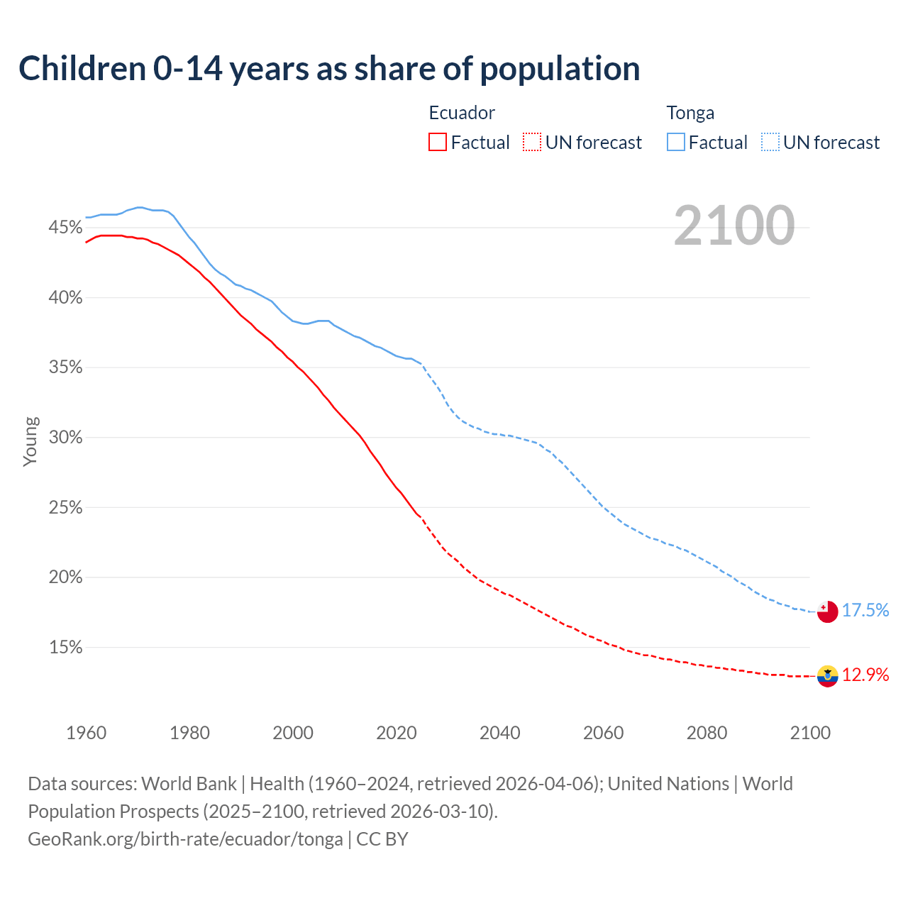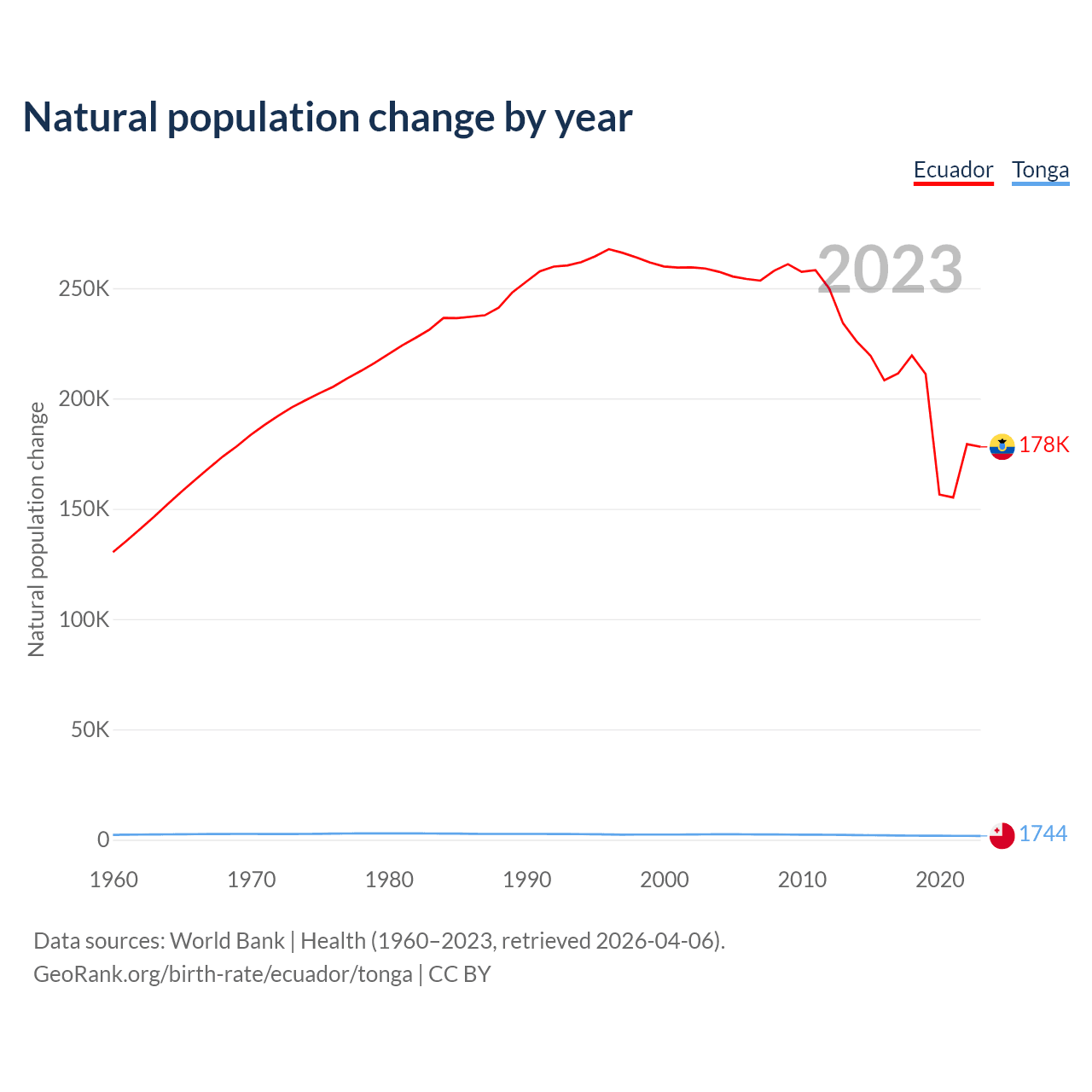 Ecuador has an annual birth rate of 15 births per 1,000 people, compared to 23.1 for Tonga. The average number of children a woman is expected to have during her lifetime — the fertility rate, is 1.82 in Ecuador and 3.13 in Tonga — 71.6% difference.