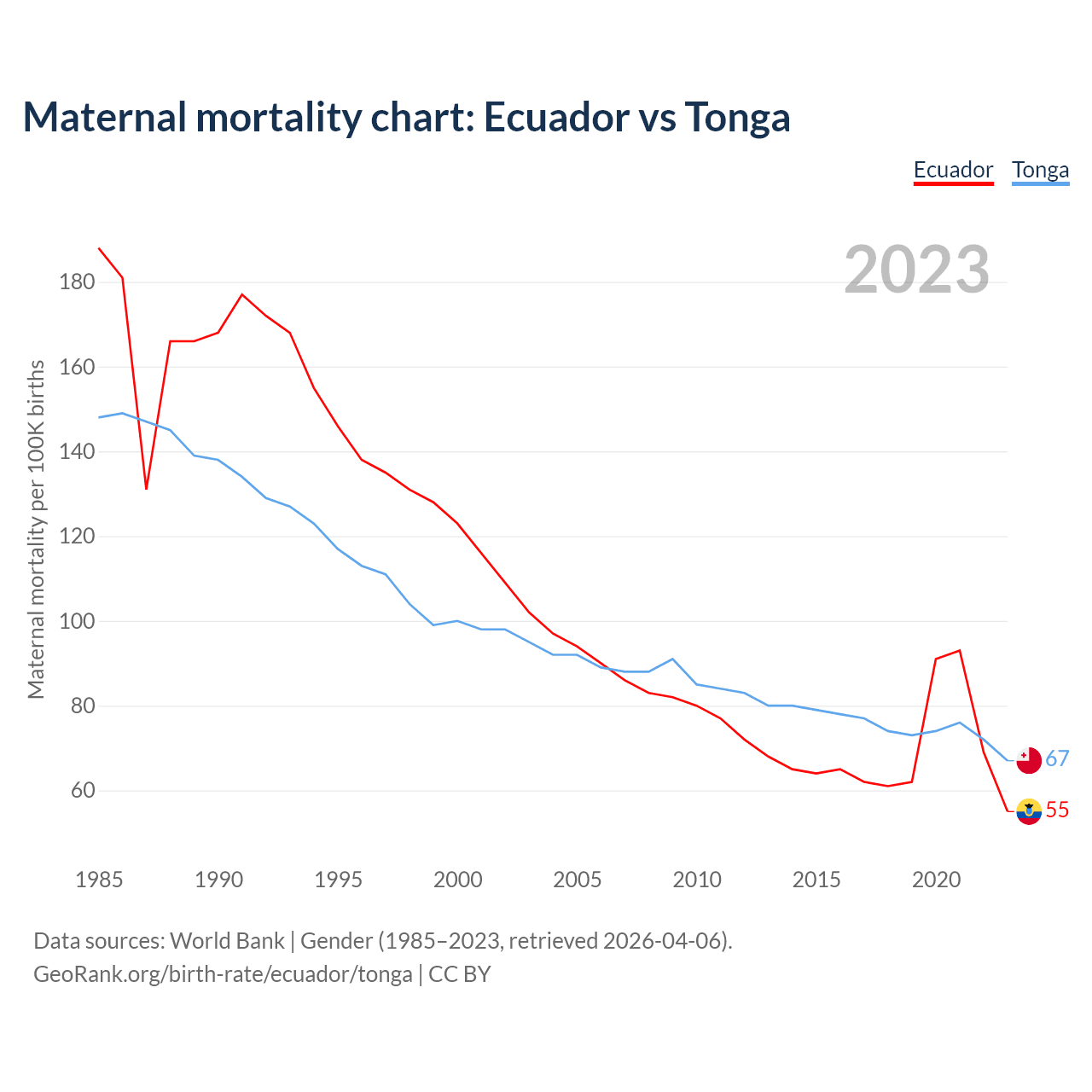 The maternal mortality rate, which is the probability of dying during childbirth or within 42 days of pregnancy termination, is 55 deaths per 100,000 live births in Ecuador, compared to 67 deaths in Tonga.