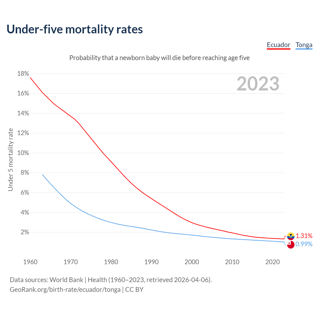 The chance that a newborn baby will die before reaching age five is 1.31% in Ecuador and 0.99% in Tonga. Above is a chart with historical data on under-five mortality rates.