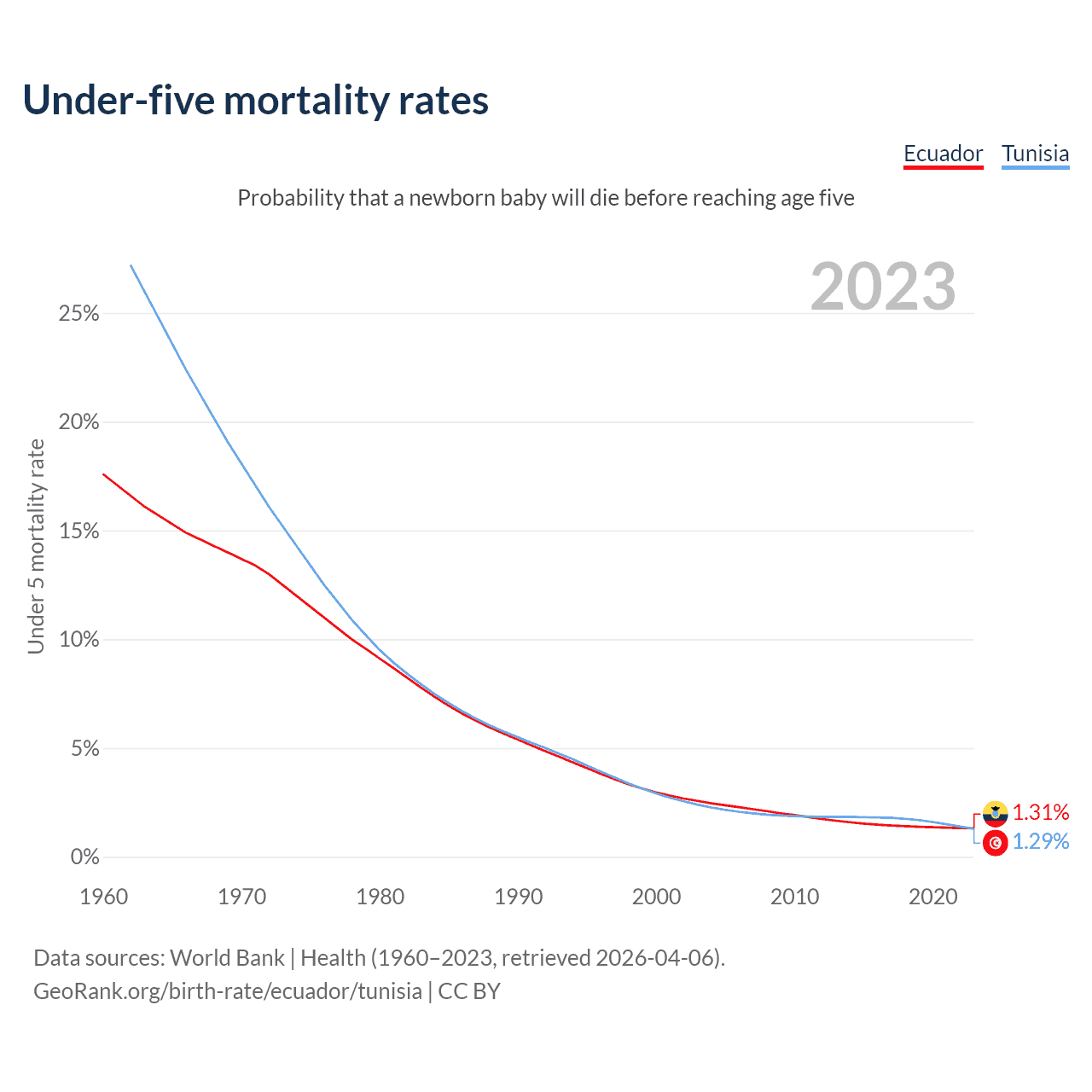 The chance that a newborn baby will die before reaching age five is 1.31% in Ecuador and 1.29% in Tunisia. Above is a chart with historical data on under-five mortality rates.