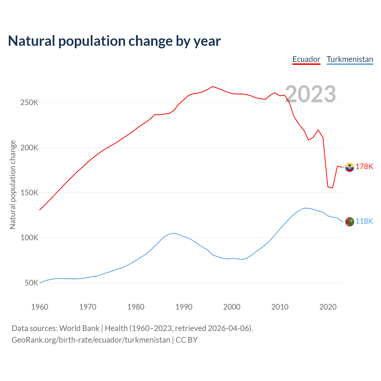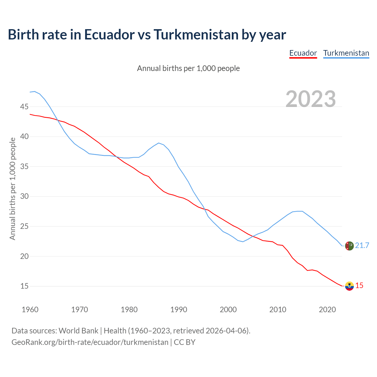 Ecuador has an annual birth rate of 15 births per 1,000 people, compared to 21.7 for Turkmenistan. The average number of children a woman is expected to have during her lifetime — the fertility rate, is 1.82 in Ecuador and 2.69 in Turkmenistan — 47.6% difference.