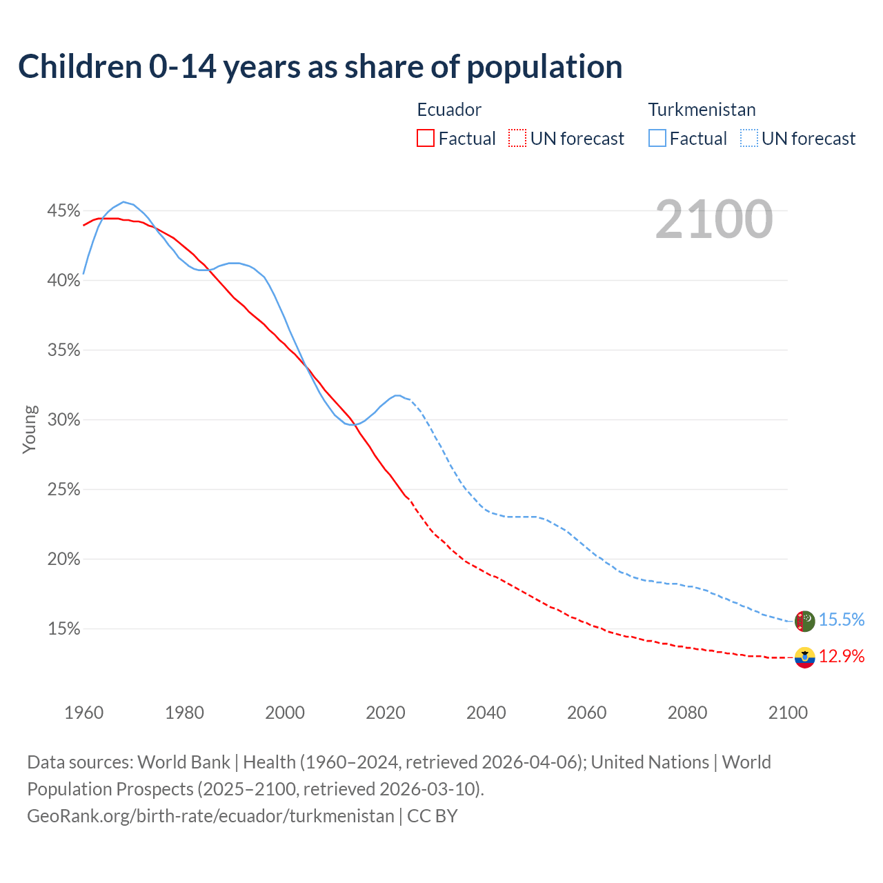 According to the latest available data on birth rates, the fertility rate in Ecuador was 1.82 children per woman in 2023, compared to 2.69 in Turkmenistan in 2023. The replacement level is considered to be 2.1 children per woman.