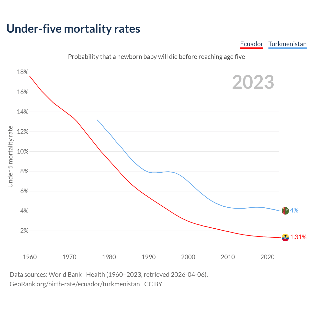 The chance that a newborn baby will die before reaching age five is 1.31% in Ecuador and 4% in Turkmenistan. Above is a chart with historical data on under-five mortality rates.