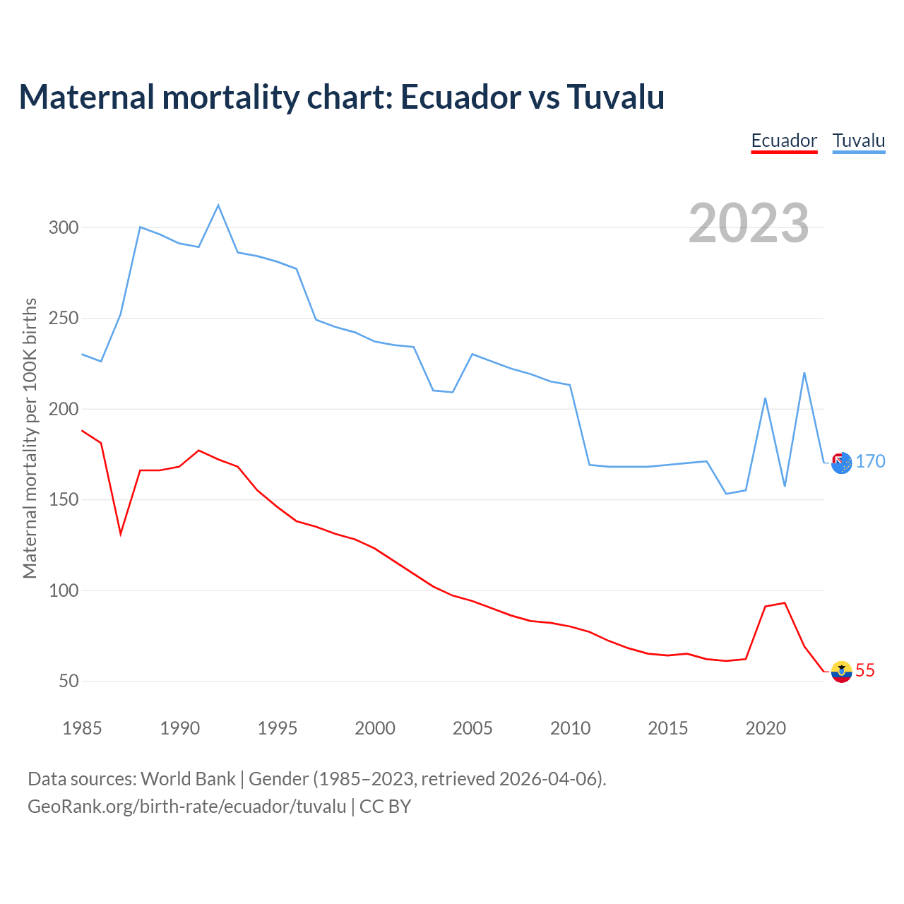 The maternal mortality rate, which is the probability of dying during childbirth or within 42 days of pregnancy termination, is 55 deaths per 100,000 live births in Ecuador, compared to 170 deaths in Tuvalu.