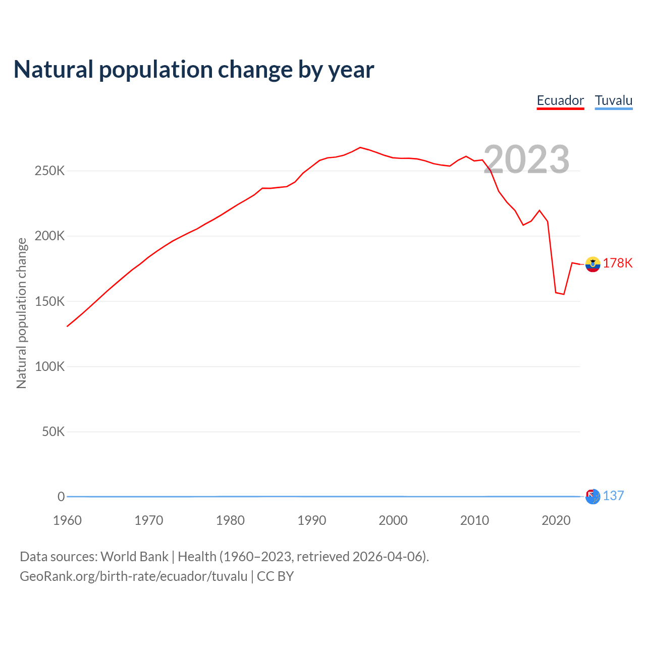 Ecuador has an annual birth rate of 15 births per 1,000 people, compared to 23.1 for Tuvalu. The average number of children a woman is expected to have during her lifetime — the fertility rate, is 1.82 in Ecuador and 3.21 in Tuvalu — 76% difference.
