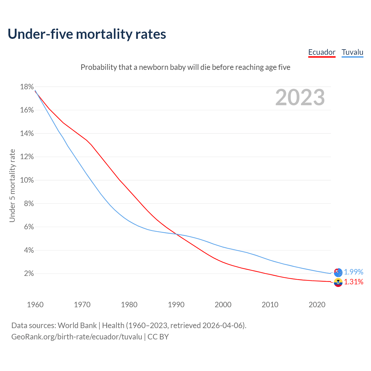 The chance that a newborn baby will die before reaching age five is 1.31% in Ecuador and 1.99% in Tuvalu. Above is a chart with historical data on under-five mortality rates.