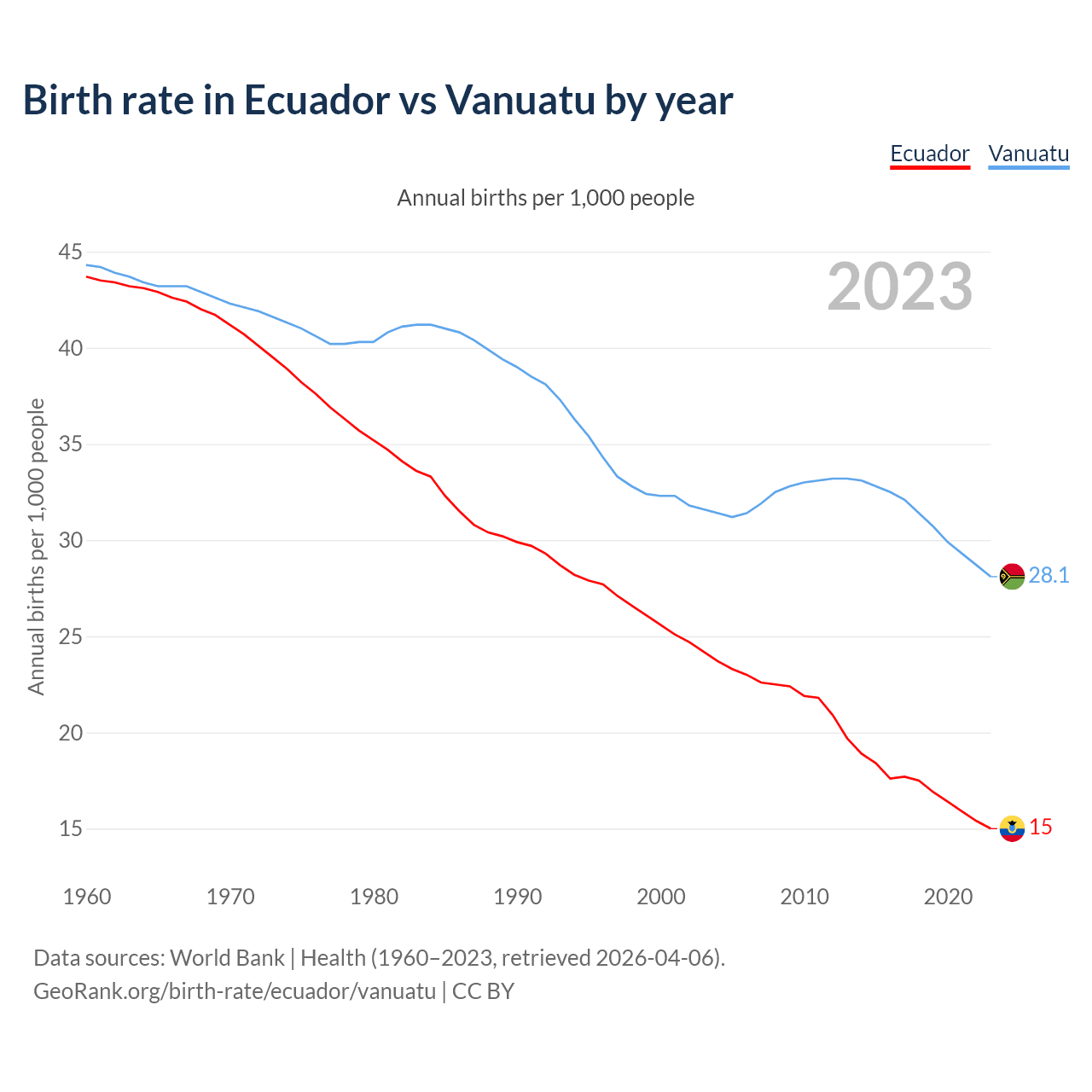 Ecuador has an annual birth rate of 15 births per 1,000 people, compared to 28.1 for Vanuatu. The average number of children a woman is expected to have during her lifetime — the fertility rate, is 1.82 in Ecuador and 3.6 in Vanuatu — 97.3% difference.