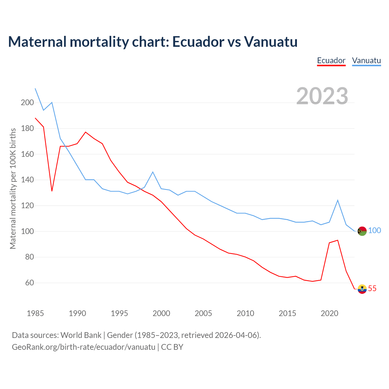 The maternal mortality rate, which is the probability of dying during childbirth or within 42 days of pregnancy termination, is 55 deaths per 100,000 live births in Ecuador, compared to 100 deaths in Vanuatu.