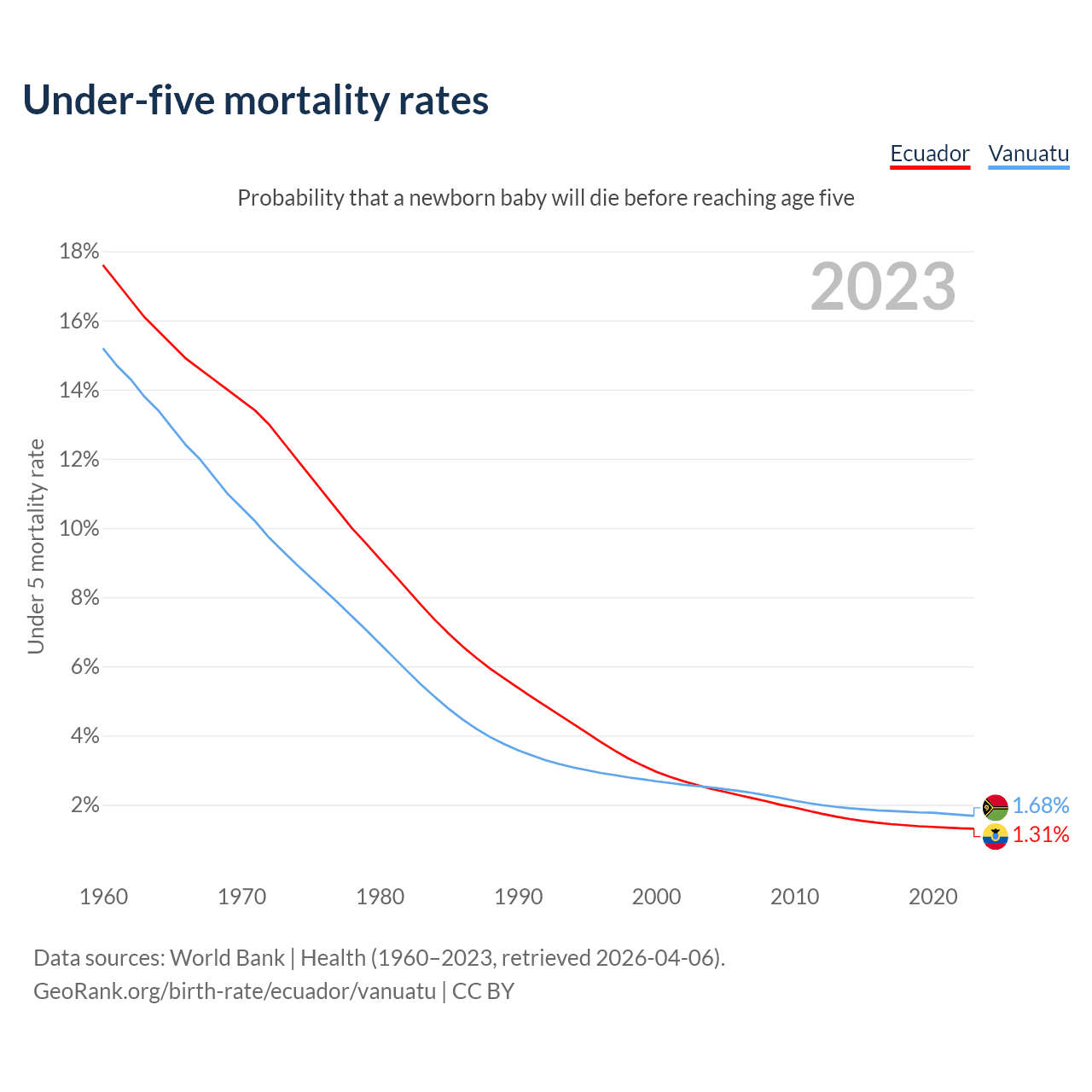 The chance that a newborn baby will die before reaching age five is 1.31% in Ecuador and 1.68% in Vanuatu. Above is a chart with historical data on under-five mortality rates.