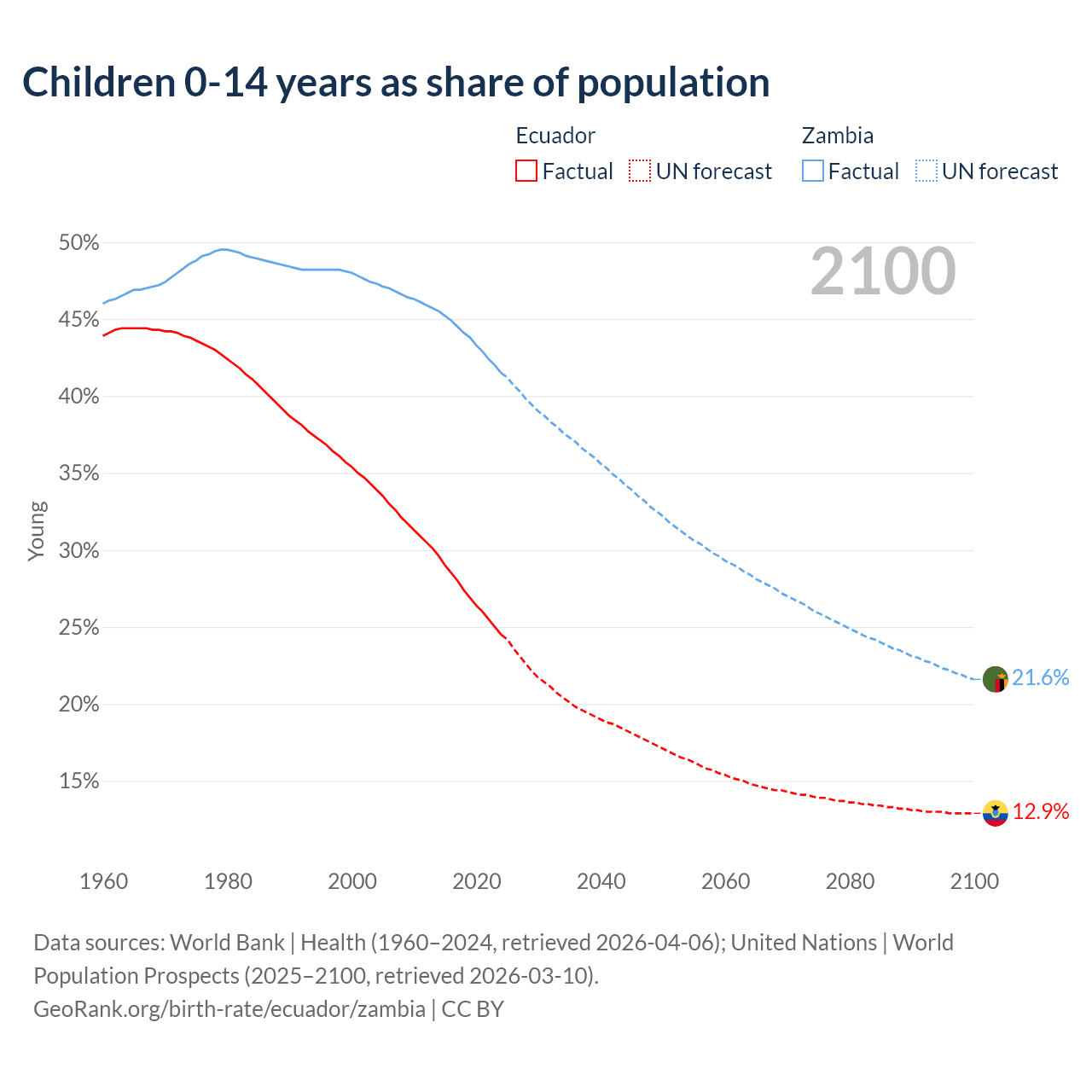 According to the latest available data on birth rates, the fertility rate in Ecuador was 1.82 children per woman in 2023, compared to 4.1 in Zambia in 2023. The replacement level is considered to be 2.1 children per woman.