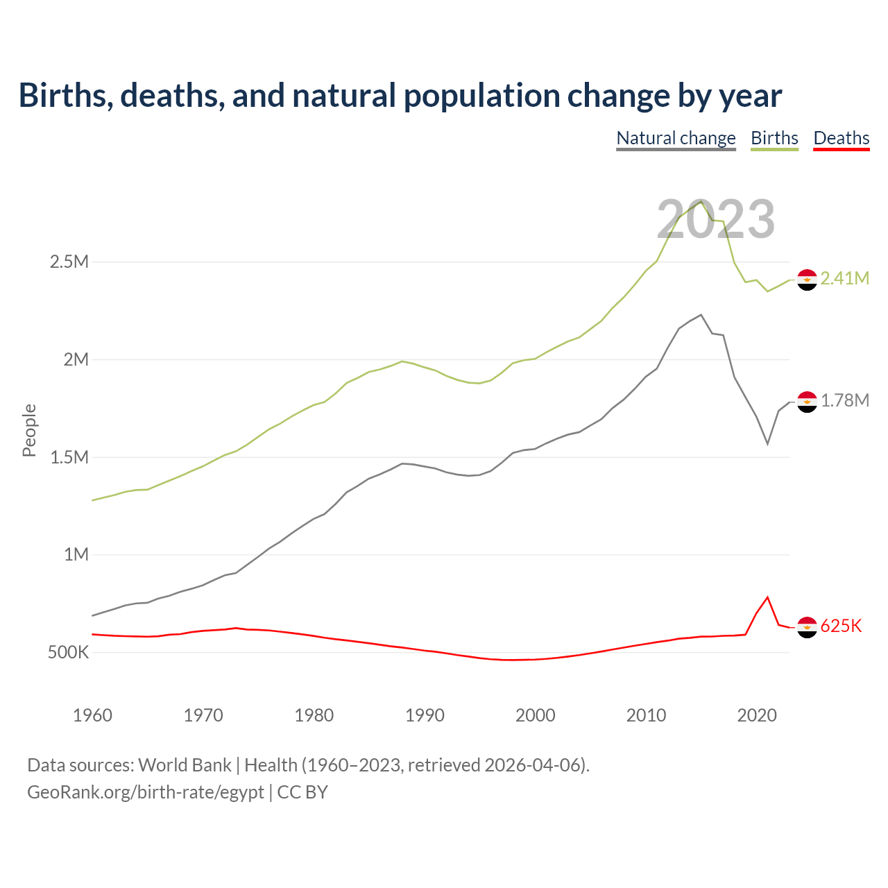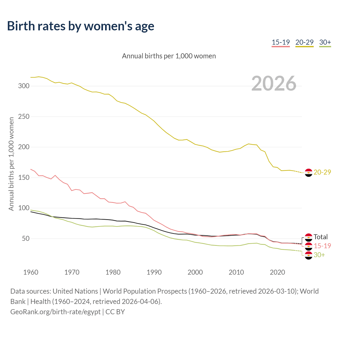 Egypt has a birth rate of 21 (annual births per 1,000 people) and a fertility rate of 2.75 (the average number of children a woman is expected to have over her lifetime based on current age-specific birth rates).