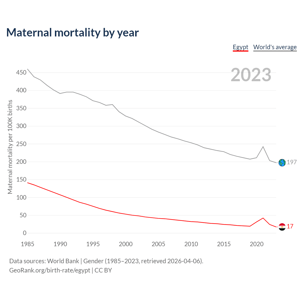 The maternal mortality rate in Egypt was 17 deaths per 100,000 live births in 2023 — a 0.02% chance of dying during childbirth or within 42 days of pregnancy termination. This is a 67.9% decrease compared to the year 2000.