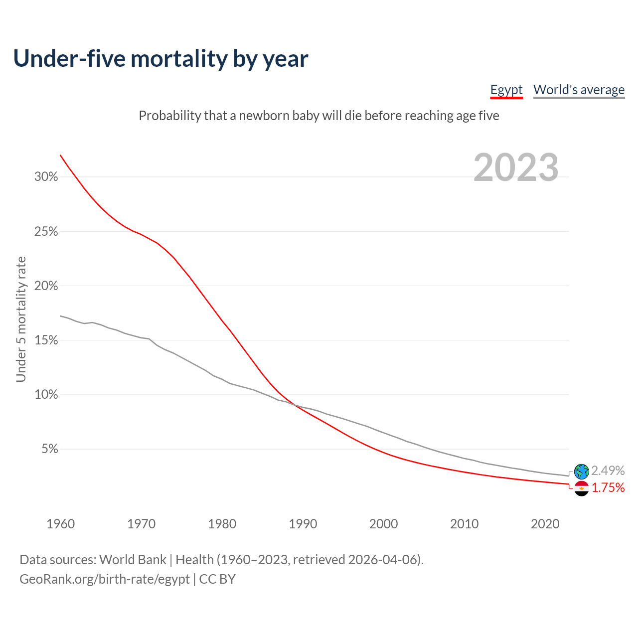 The under-5 mortality rate in Egypt was 17.5 deaths per 1,000 live births in 2023 — a 1.75% chance that a newborn baby will die before reaching age five. This is down from 46.6 deaths per 1,000 live births in 2000.