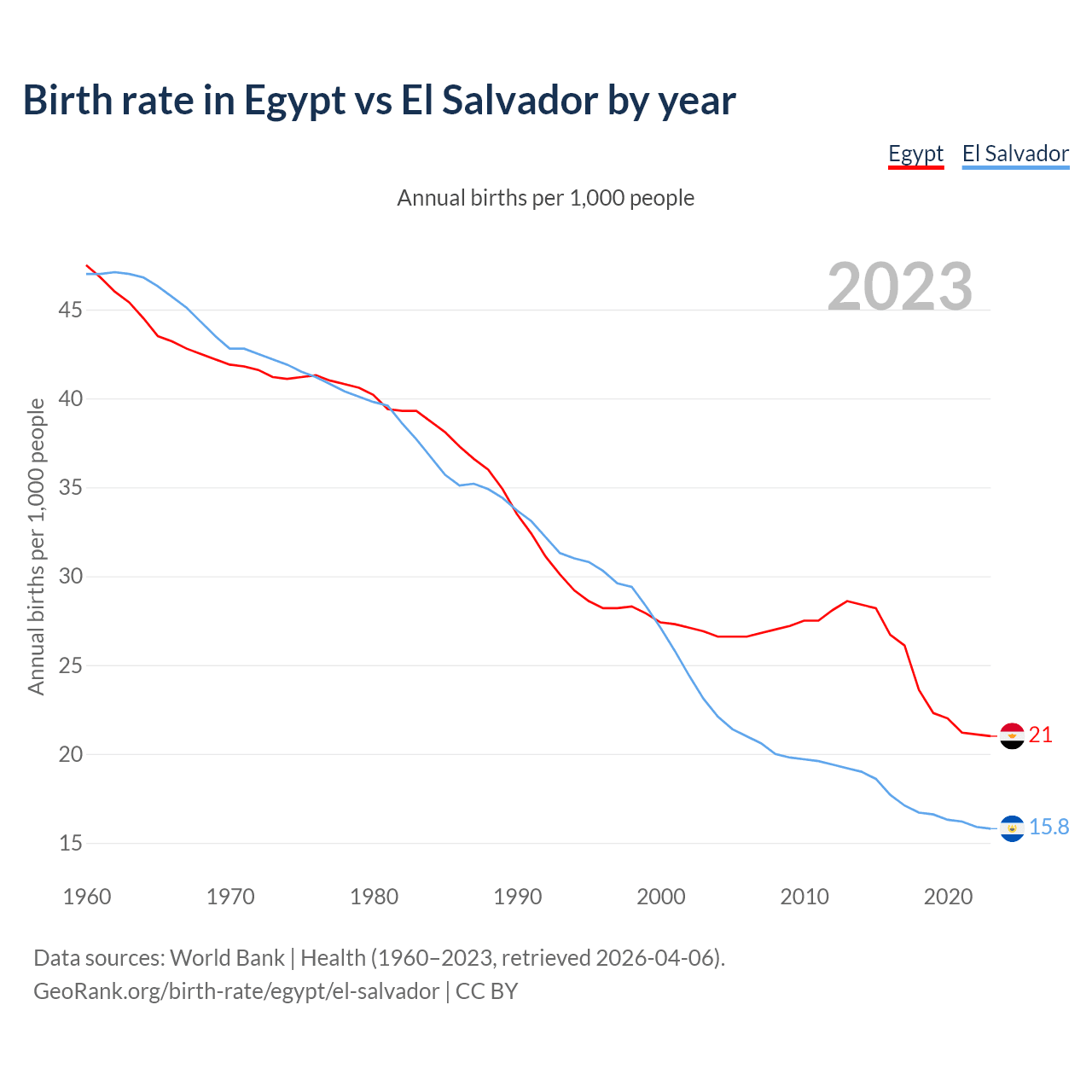 Egypt has an annual birth rate of 21 births per 1,000 people, compared to 15.8 for El Salvador. The average number of children a woman is expected to have during her lifetime — the fertility rate, is 2.75 in Egypt and 1.78 in El Salvador — 35.5% difference.