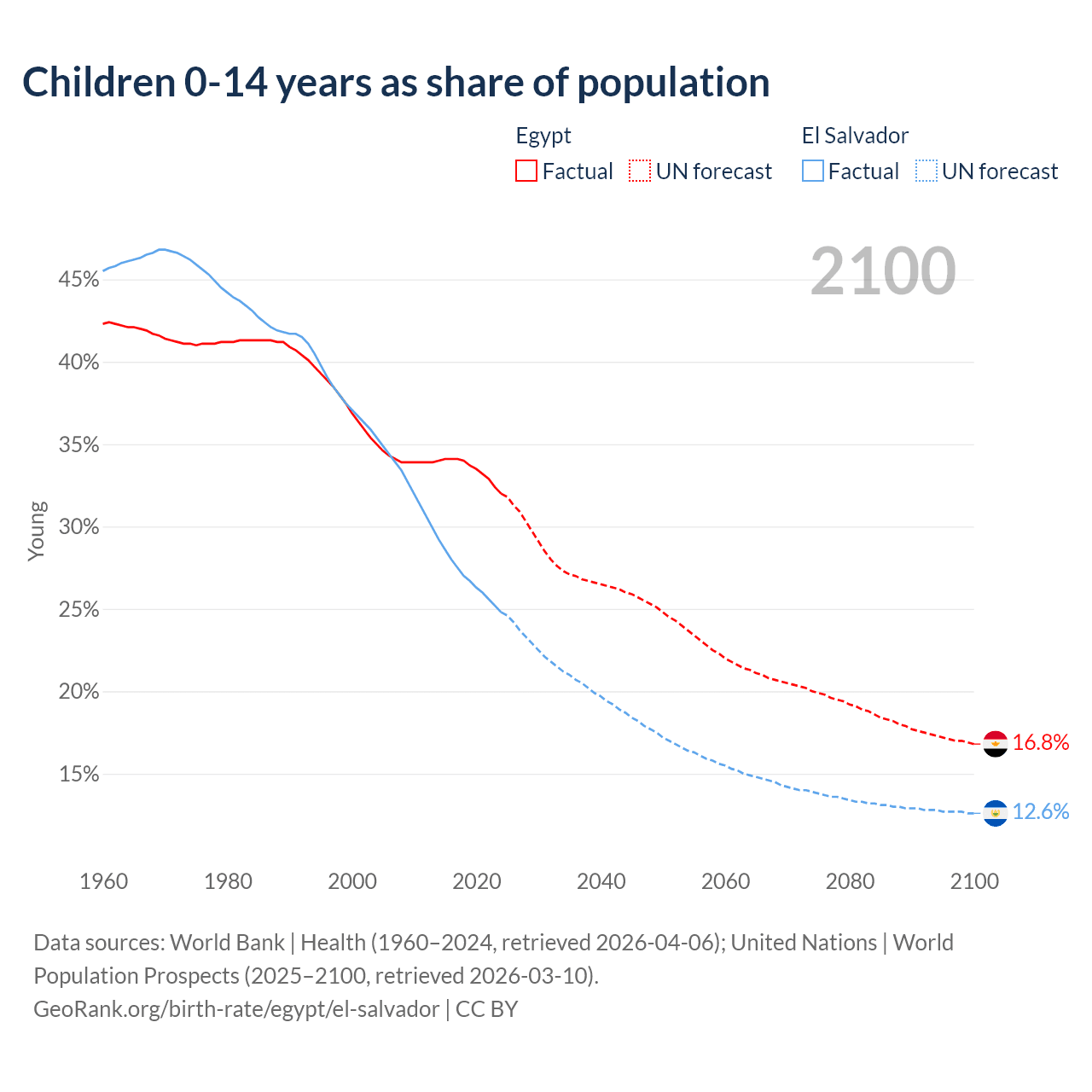 According to the latest available data on birth rates, the fertility rate in Egypt was 2.75 children per woman in 2023, compared to 1.78 in El Salvador in 2023. The replacement level is considered to be 2.1 children per woman.