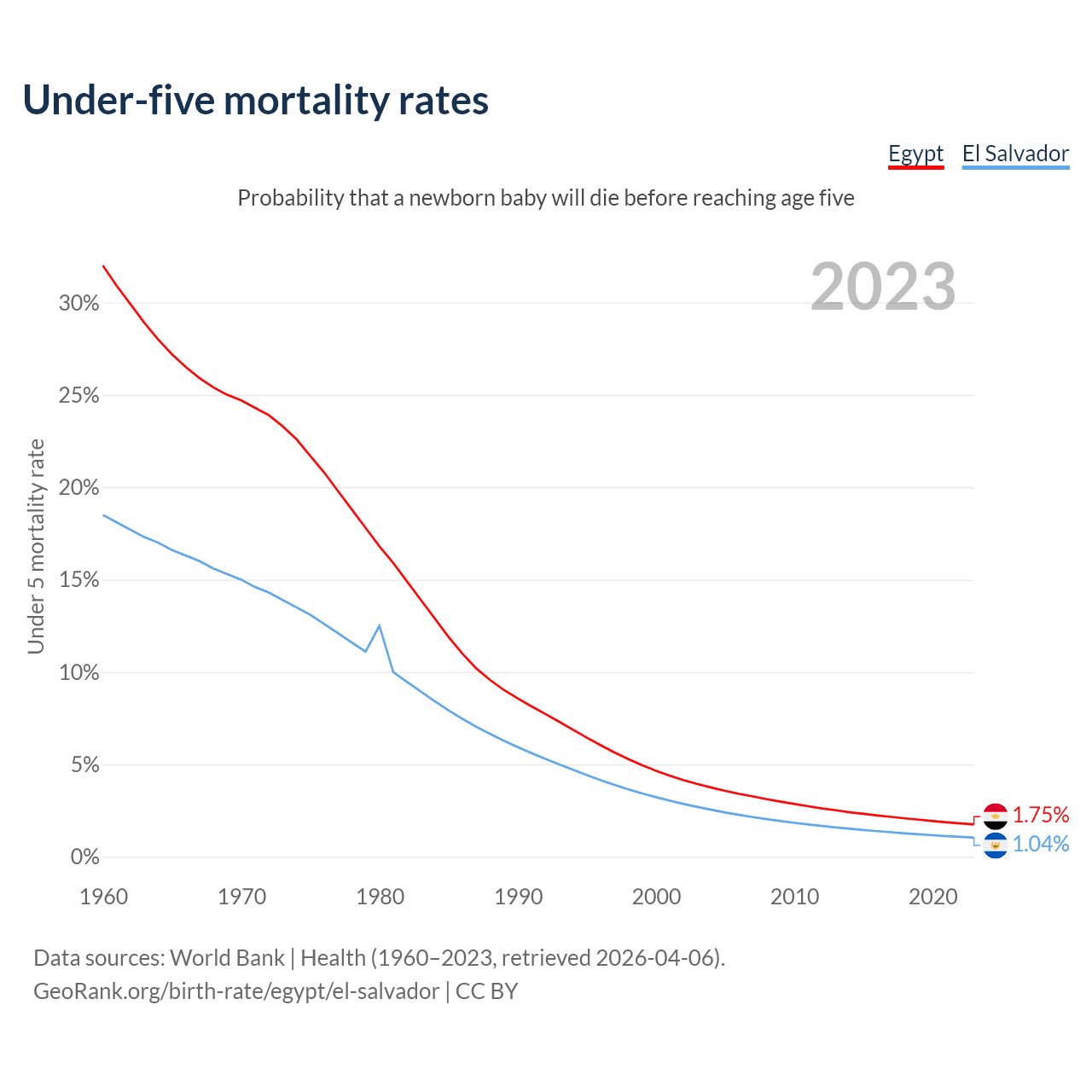 The chance that a newborn baby will die before reaching age five is 1.75% in Egypt and 1.04% in El Salvador. Above is a chart with historical data on under-five mortality rates.
