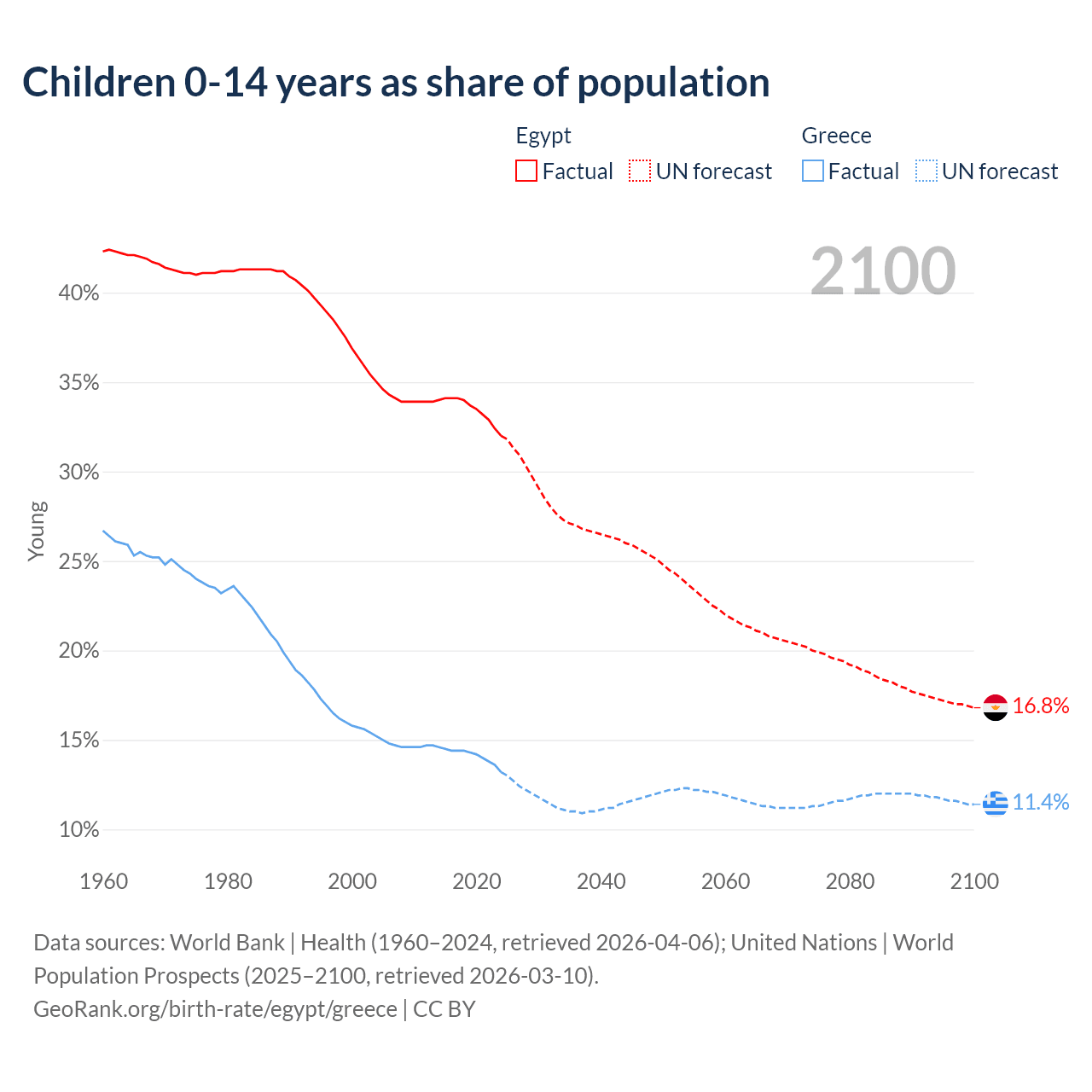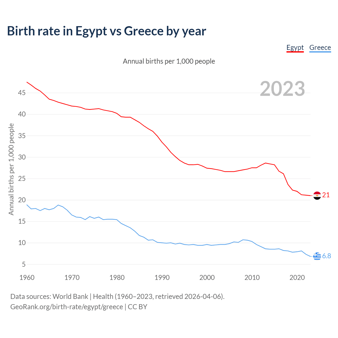 Egypt has an annual birth rate of 21 births per 1,000 people, compared to 6.8 for Greece. The average number of children a woman is expected to have during her lifetime — the fertility rate, is 2.75 in Egypt and 1.32 in Greece — 52% difference.
