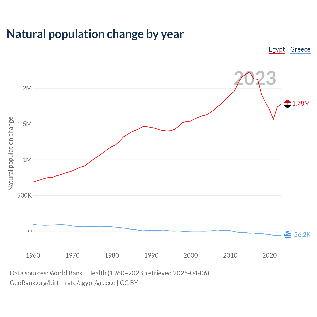 According to the latest available data on birth rates, the fertility rate in Egypt was 2.75 children per woman in 2023, compared to 1.32 in Greece in 2023. The replacement level is considered to be 2.1 children per woman.