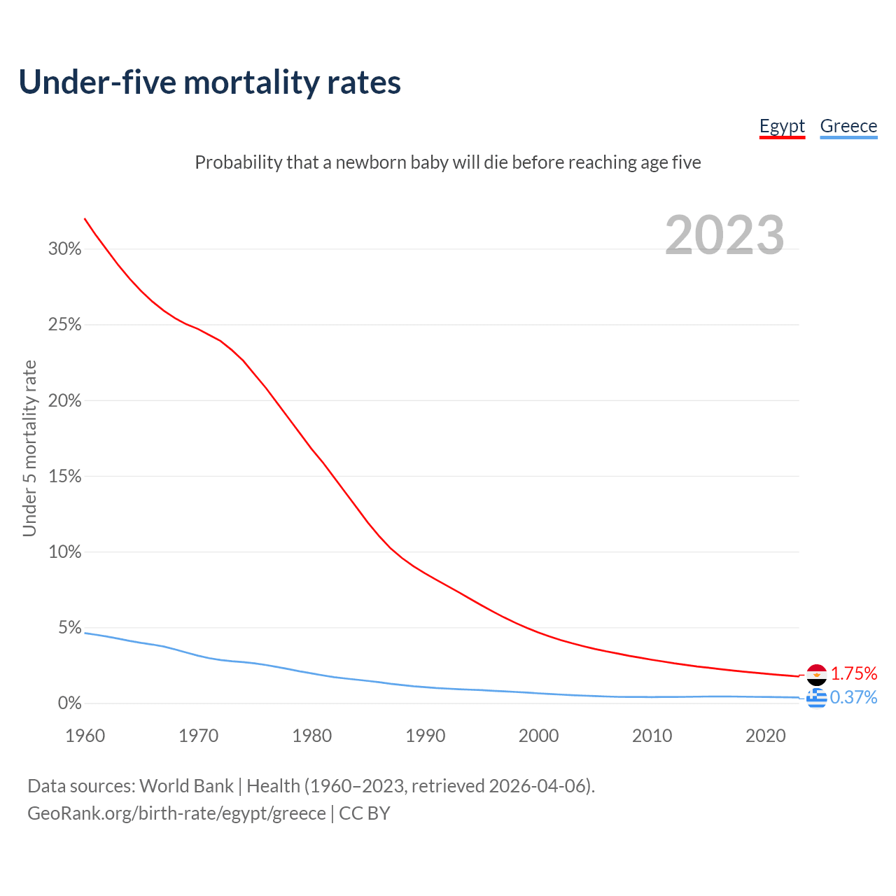 The chance that a newborn baby will die before reaching age five is 1.75% in Egypt and 0.37% in Greece. Above is a chart with historical data on under-five mortality rates.