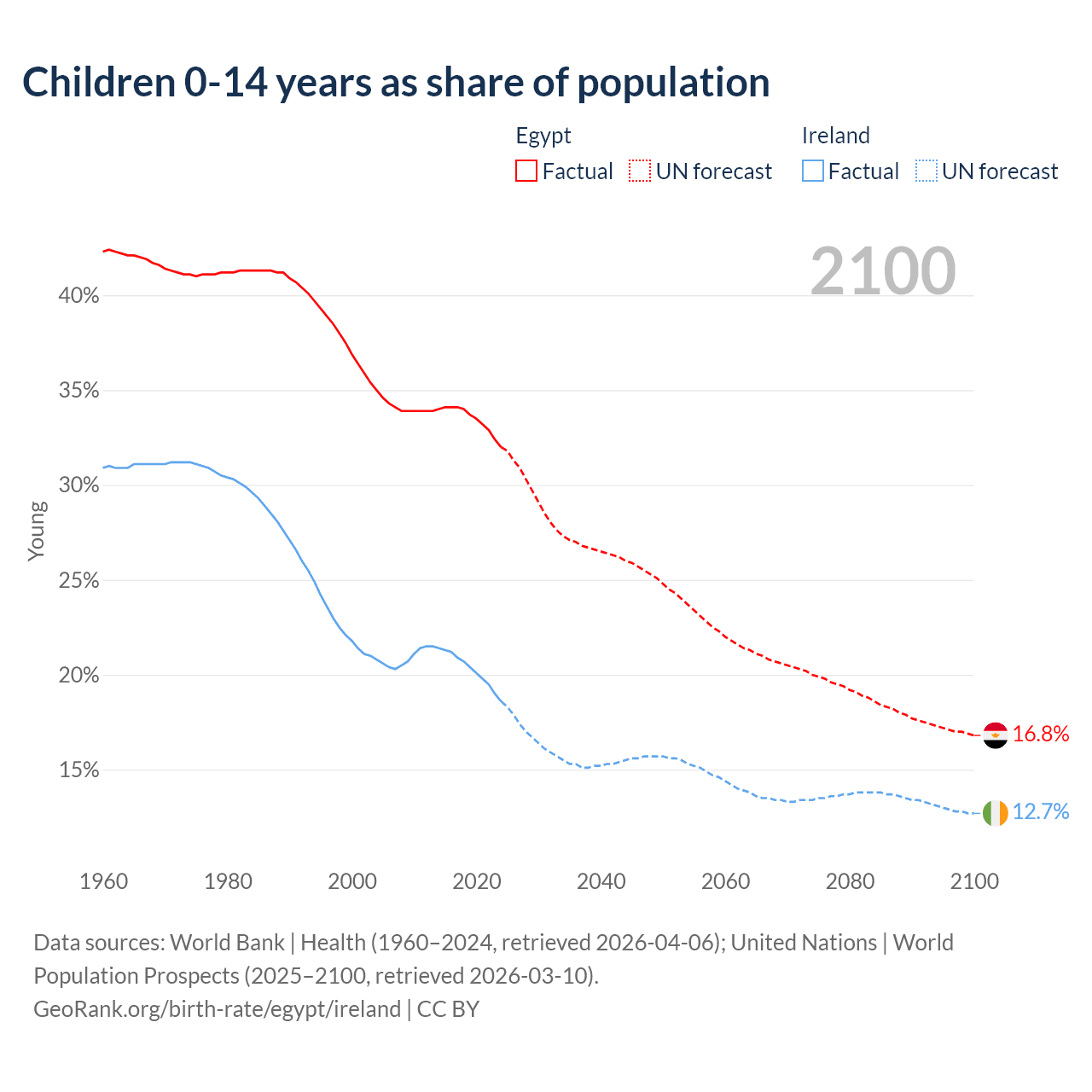According to the latest available data on birth rates, the fertility rate in Egypt was 2.75 children per woman in 2023, compared to 1.5 in Ireland in 2023. The replacement level is considered to be 2.1 children per woman.
