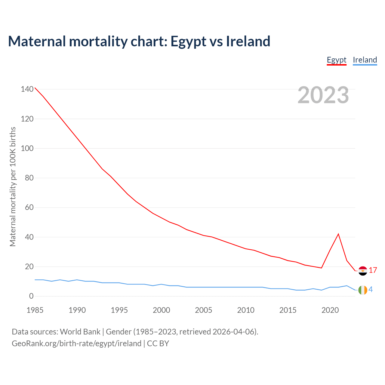 The maternal mortality rate, which is the probability of dying during childbirth or within 42 days of pregnancy termination, is 17 deaths per 100,000 live births in Egypt, compared to 4 deaths in Ireland.