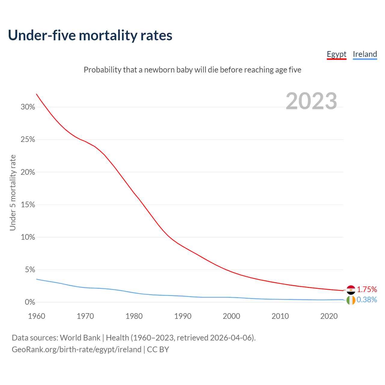 The chance that a newborn baby will die before reaching age five is 1.75% in Egypt and 0.38% in Ireland. Above is a chart with historical data on under-five mortality rates.