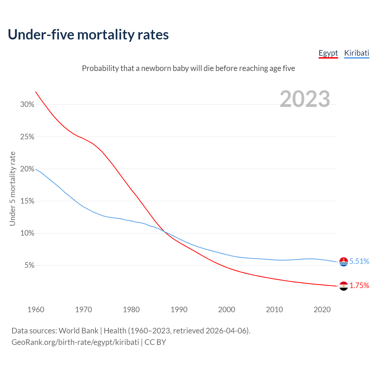 The chance that a newborn baby will die before reaching age five is 1.75% in Egypt and 5.51% in Kiribati. Above is a chart with historical data on under-five mortality rates.