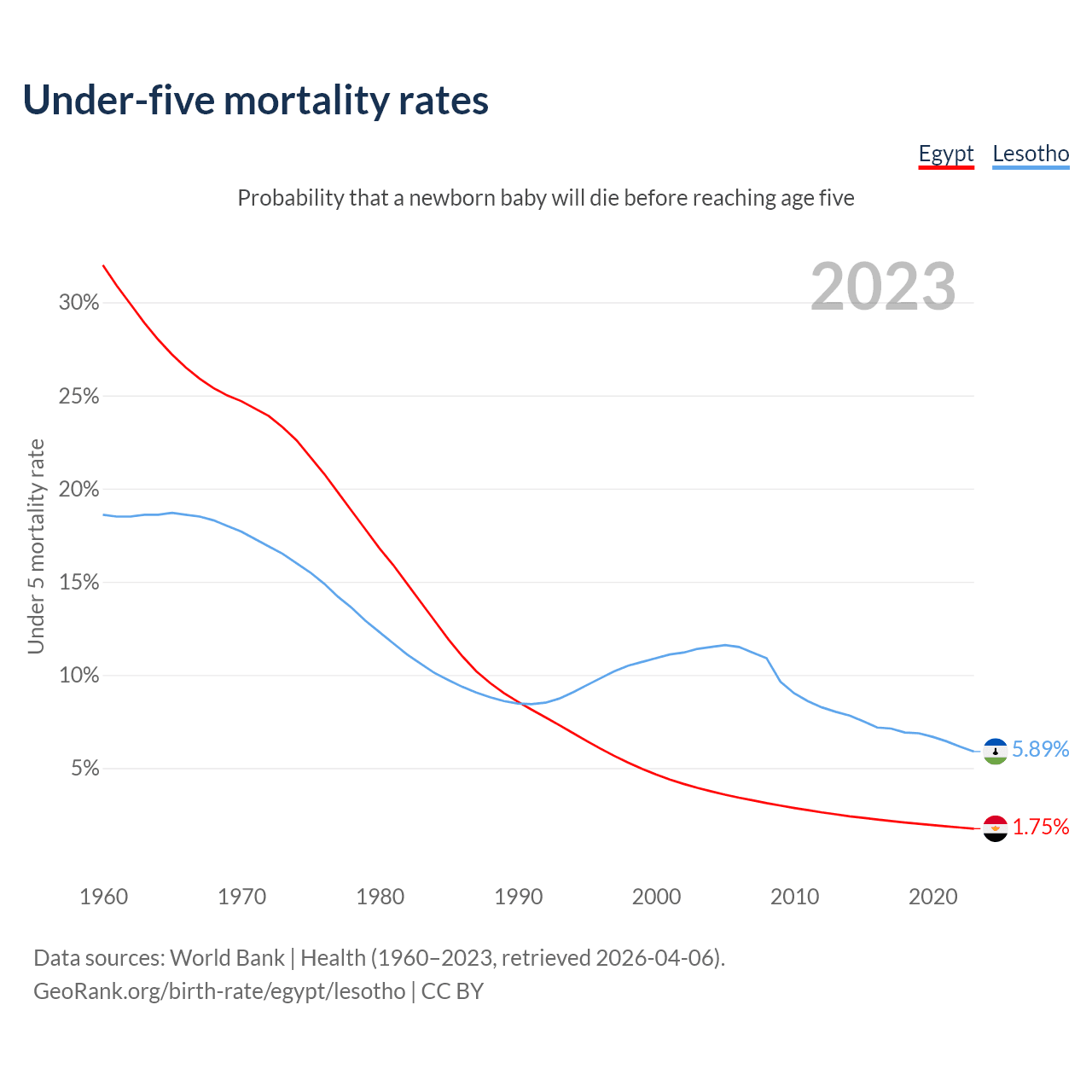 The chance that a newborn baby will die before reaching age five is 1.75% in Egypt and 5.89% in Lesotho. Above is a chart with historical data on under-five mortality rates.