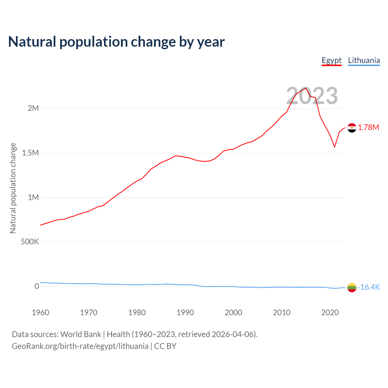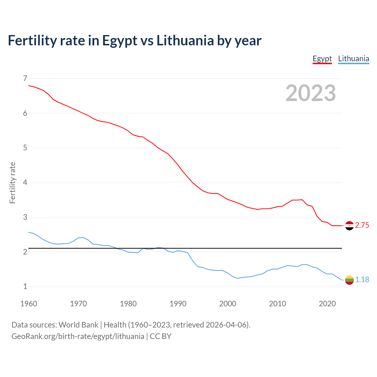 According to the latest available data on birth rates, the fertility rate in Egypt was 2.75 children per woman in 2023, compared to 1.18 in Lithuania in 2023. The replacement level is considered to be 2.1 children per woman.