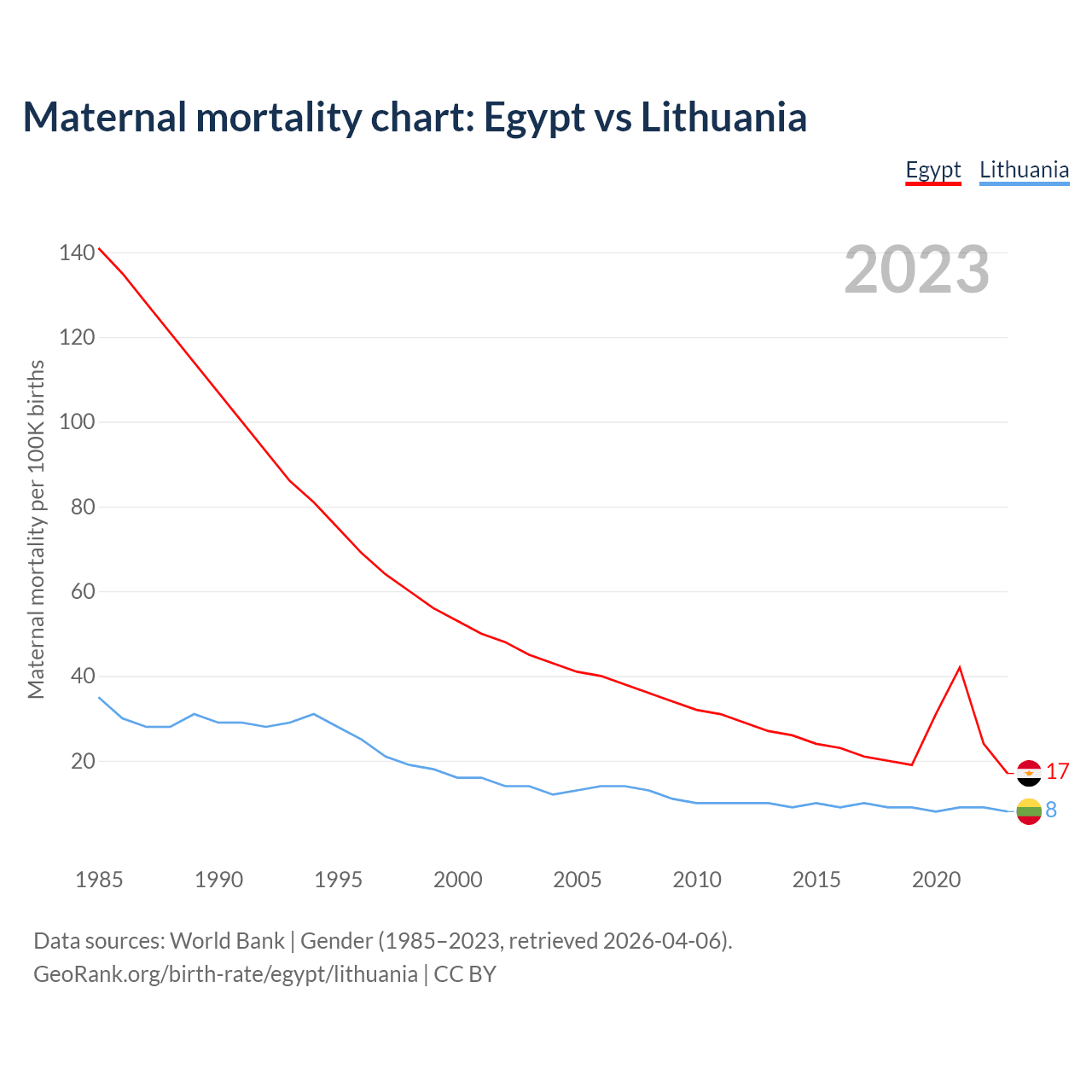 The maternal mortality rate, which is the probability of dying during childbirth or within 42 days of pregnancy termination, is 17 deaths per 100,000 live births in Egypt, compared to 8 deaths in Lithuania.