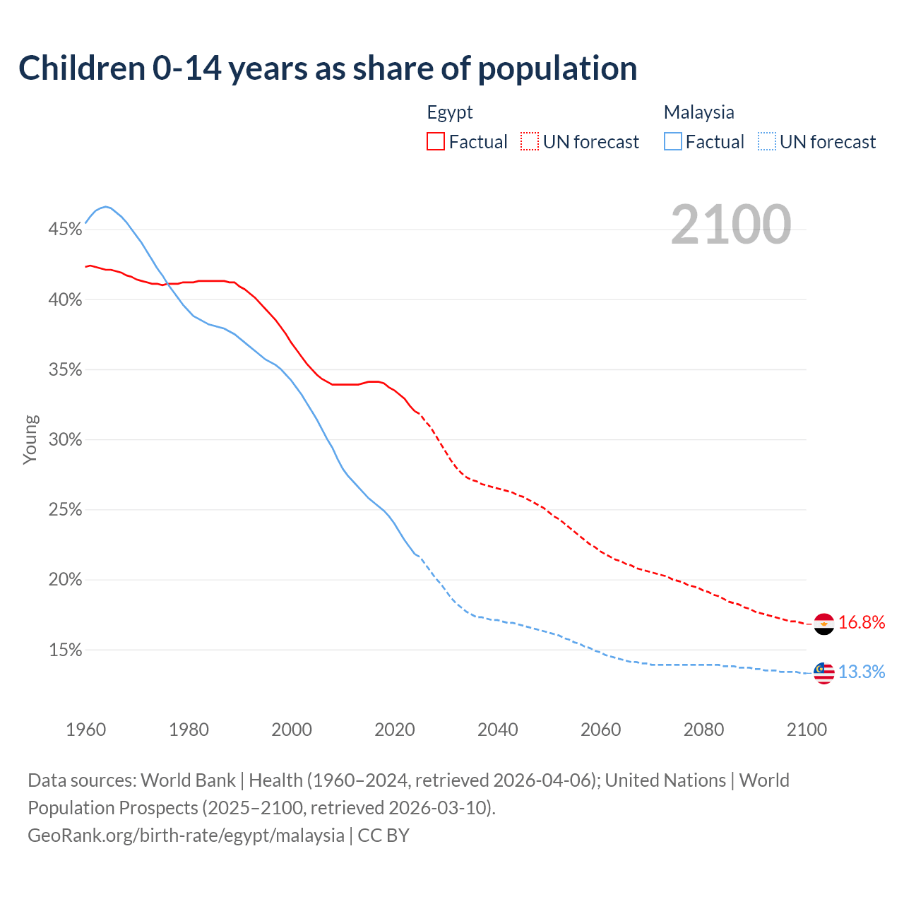 According to the latest available data on birth rates, the fertility rate in Egypt was 2.75 children per woman in 2023, compared to 1.55 in Malaysia in 2023. The replacement level is considered to be 2.1 children per woman.