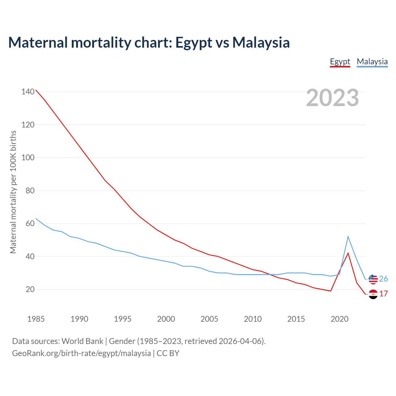 The maternal mortality rate, which is the probability of dying during childbirth or within 42 days of pregnancy termination, is 17 deaths per 100,000 live births in Egypt, compared to 26 deaths in Malaysia.