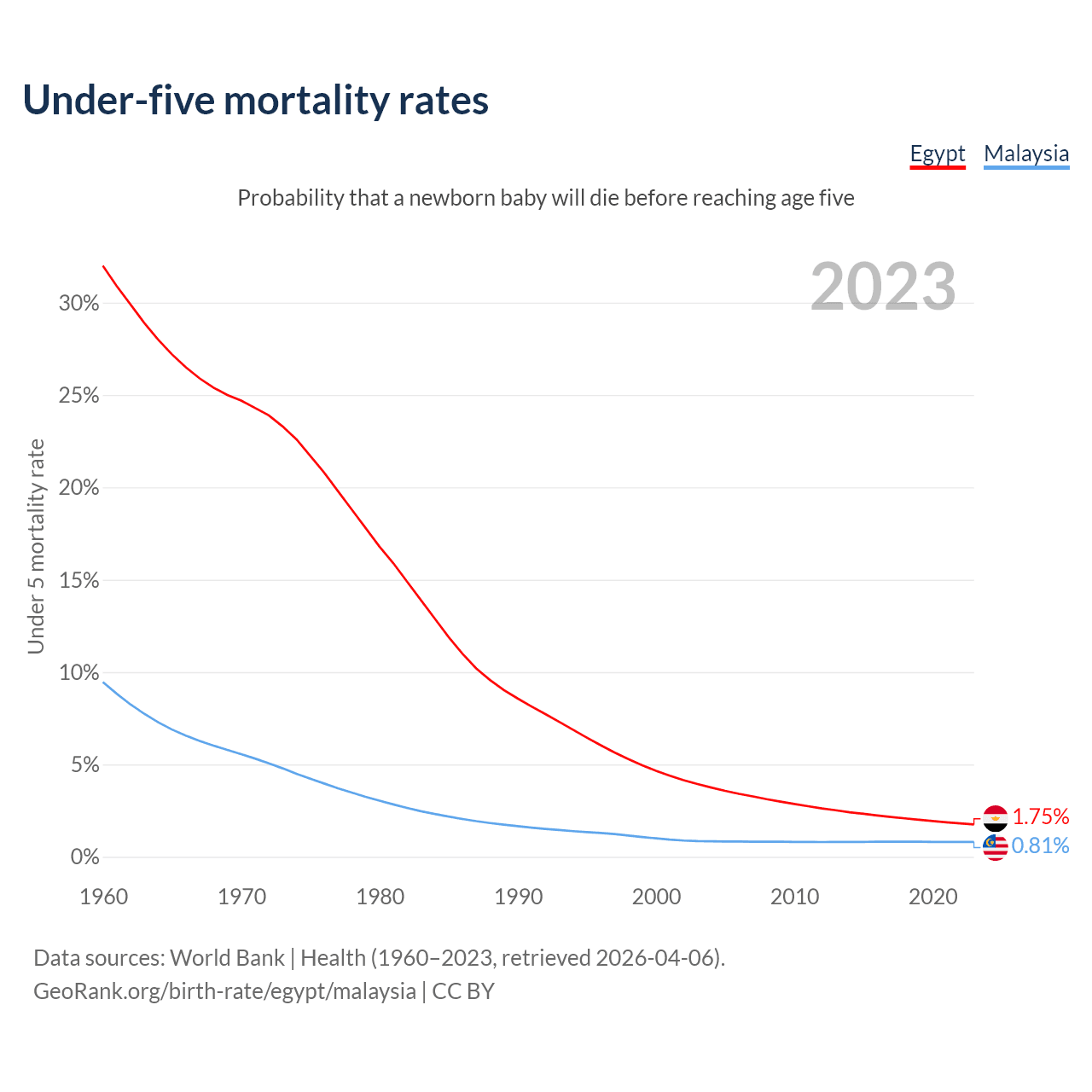 The chance that a newborn baby will die before reaching age five is 1.75% in Egypt and 0.81% in Malaysia. Above is a chart with historical data on under-five mortality rates.