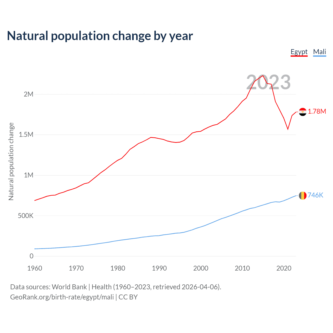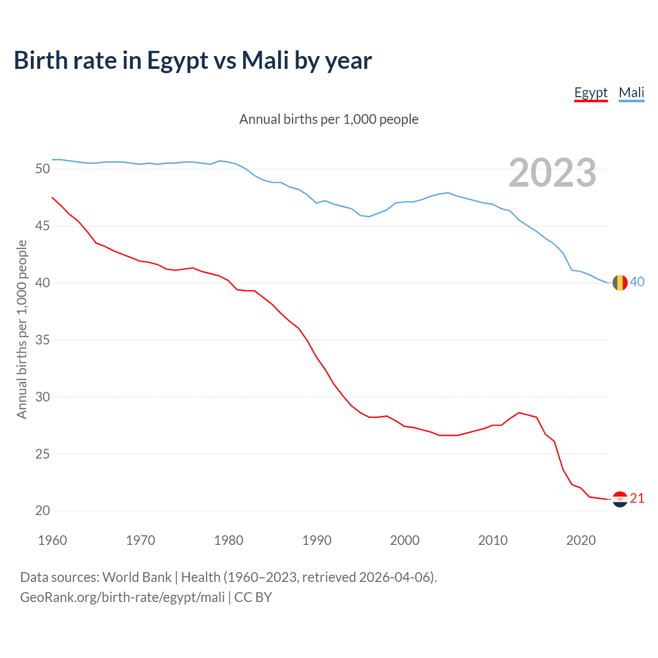 Egypt has an annual birth rate of 21 births per 1,000 people, compared to 40 for Mali. The average number of children a woman is expected to have during her lifetime — the fertility rate, is 2.75 in Egypt and 5.61 in Mali — 104.1% difference.