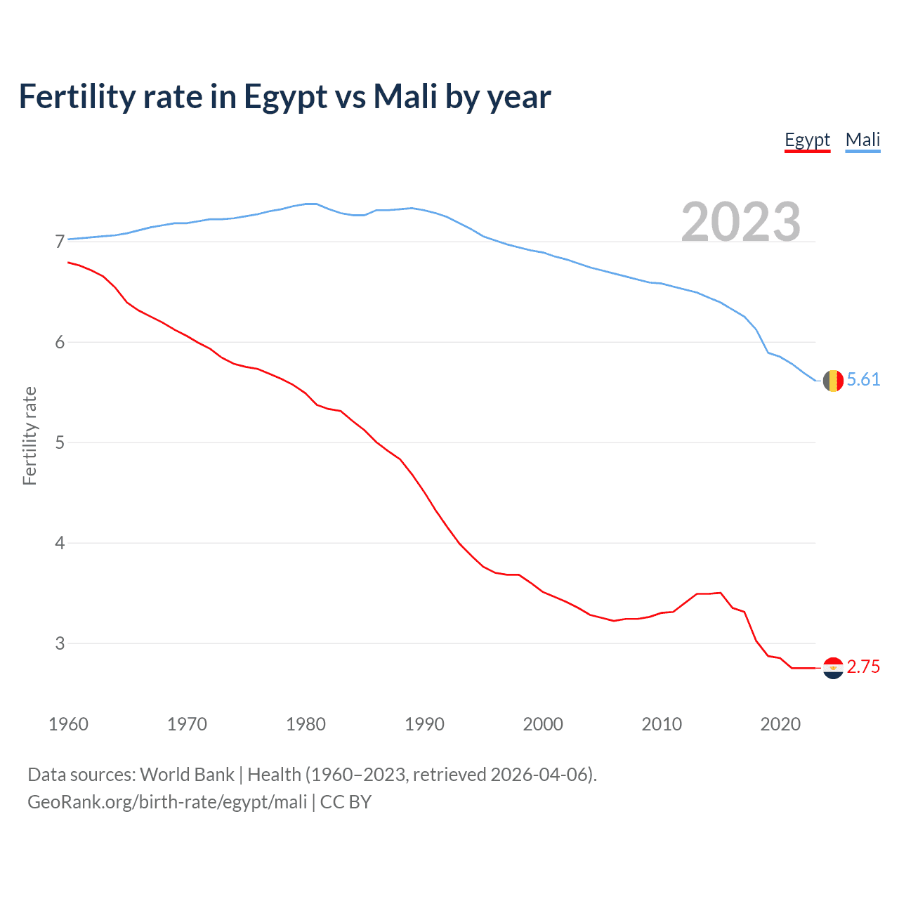 1960 vs 2023, the fertility rate has decreased by 59.5% in Egypt and by 20% in Mali — in 1960, it was 6.79 and 7.02, respectively.