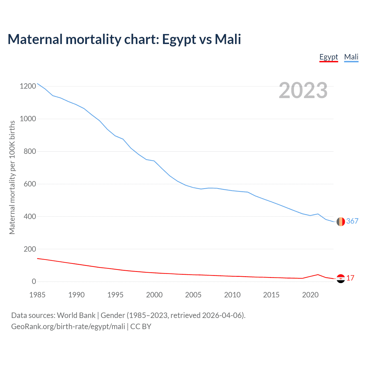 The maternal mortality rate, which is the probability of dying during childbirth or within 42 days of pregnancy termination, is 17 deaths per 100,000 live births in Egypt, compared to 367 deaths in Mali.