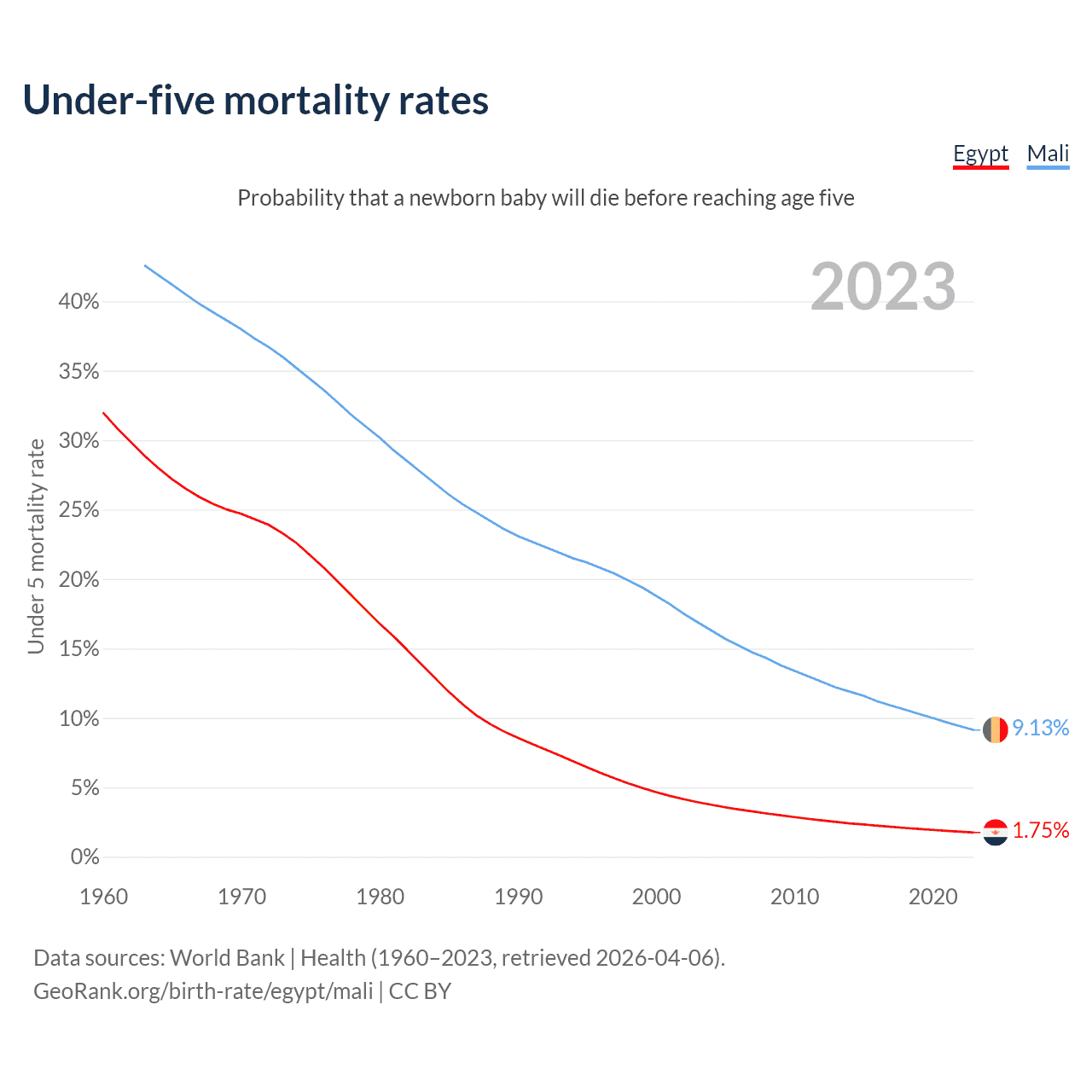 The chance that a newborn baby will die before reaching age five is 1.75% in Egypt and 9.13% in Mali. Above is a chart with historical data on under-five mortality rates.