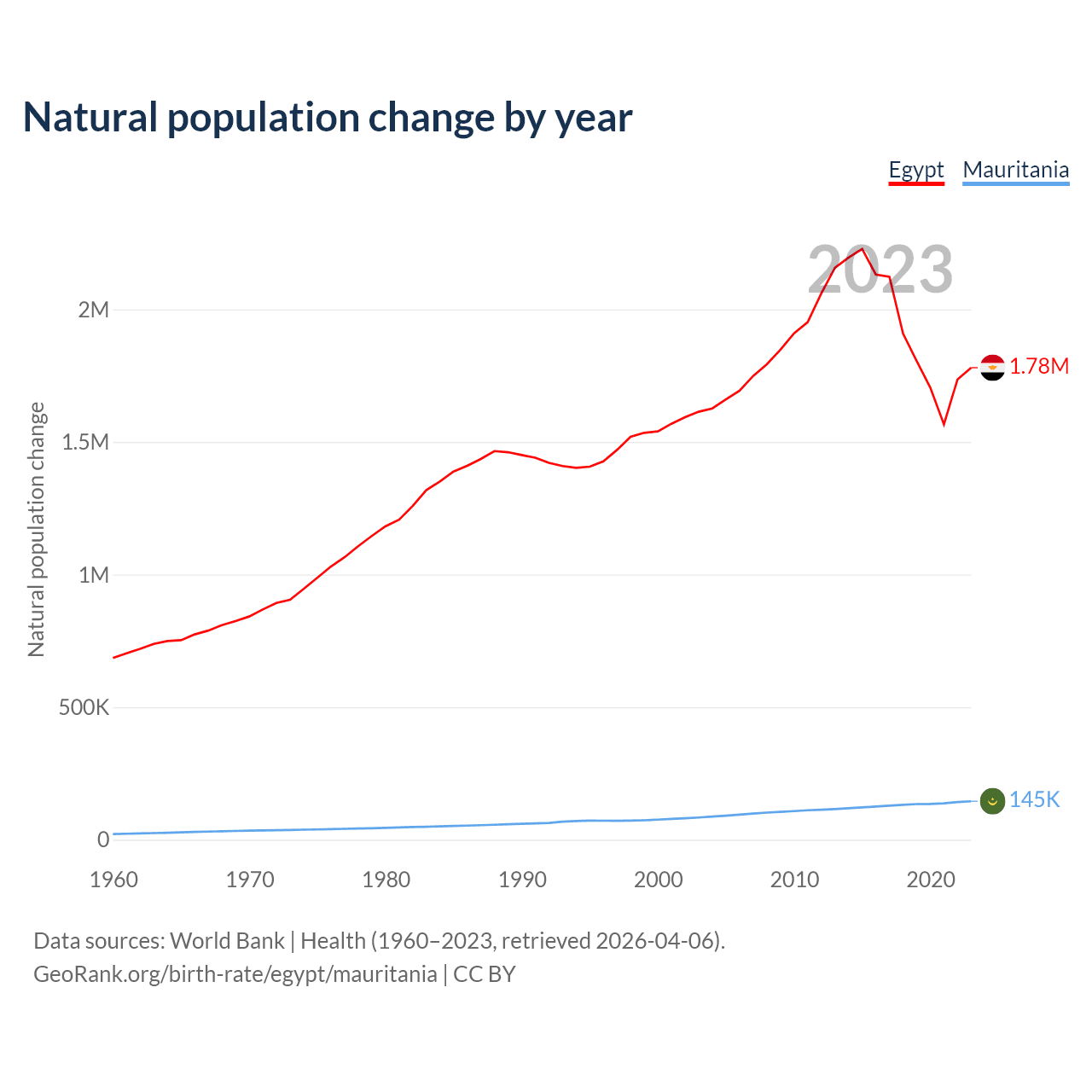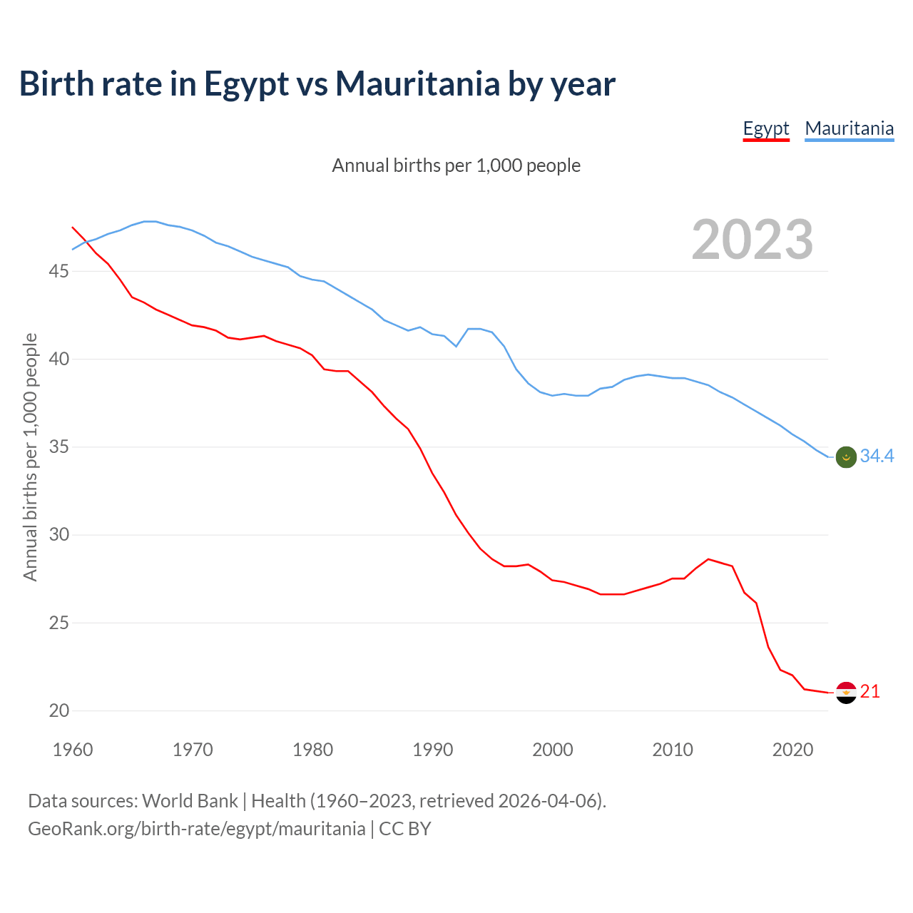 Egypt has an annual birth rate of 21 births per 1,000 people, compared to 34.4 for Mauritania. The average number of children a woman is expected to have during her lifetime — the fertility rate, is 2.75 in Egypt and 4.7 in Mauritania — 70.8% difference.