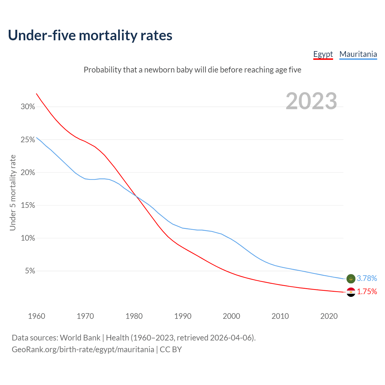 The chance that a newborn baby will die before reaching age five is 1.75% in Egypt and 3.78% in Mauritania. Above is a chart with historical data on under-five mortality rates.